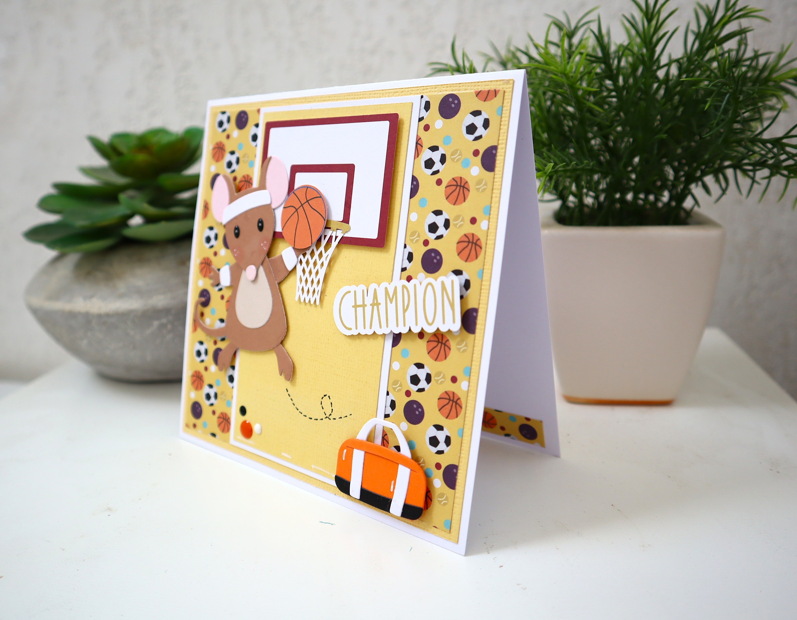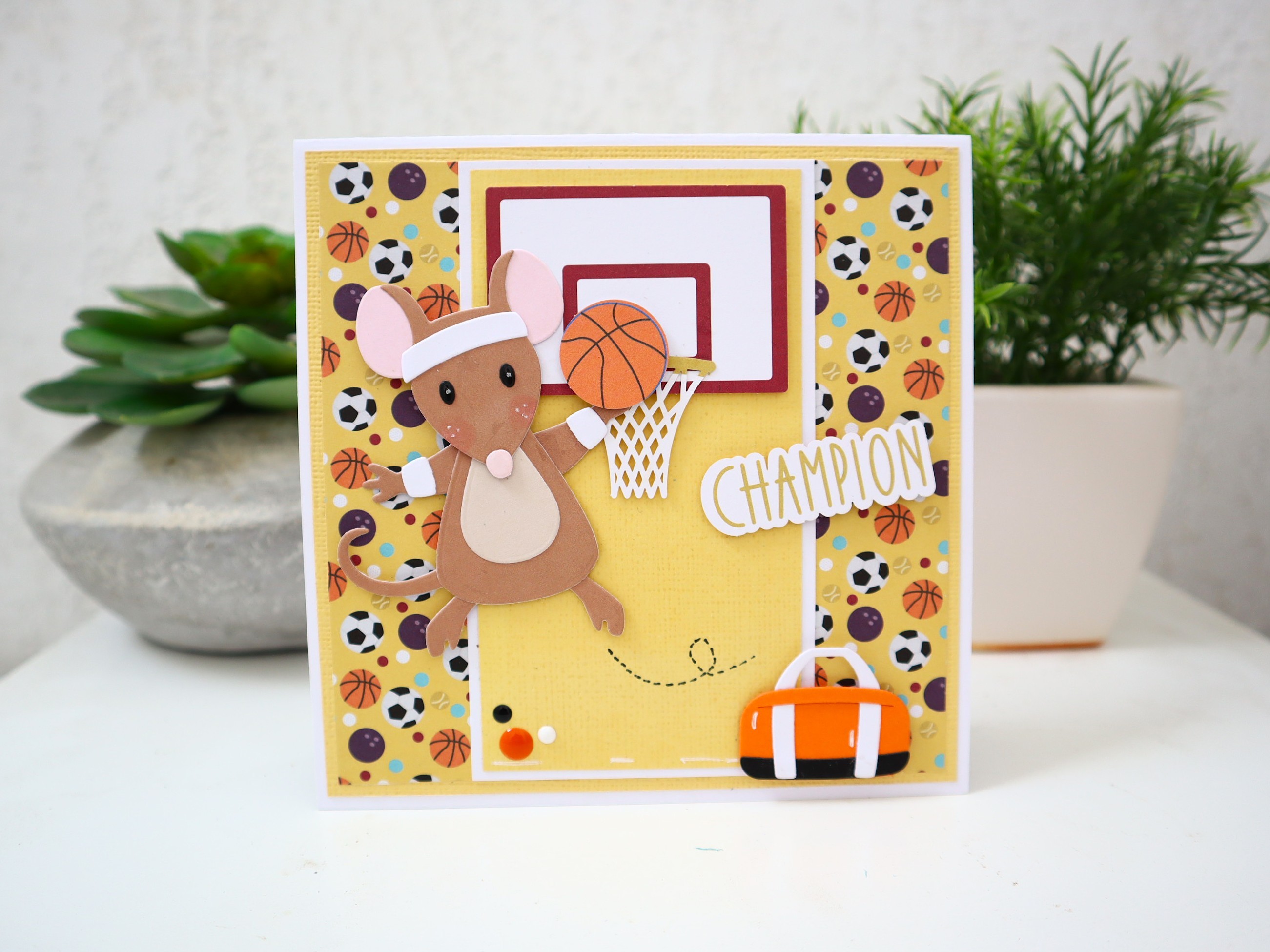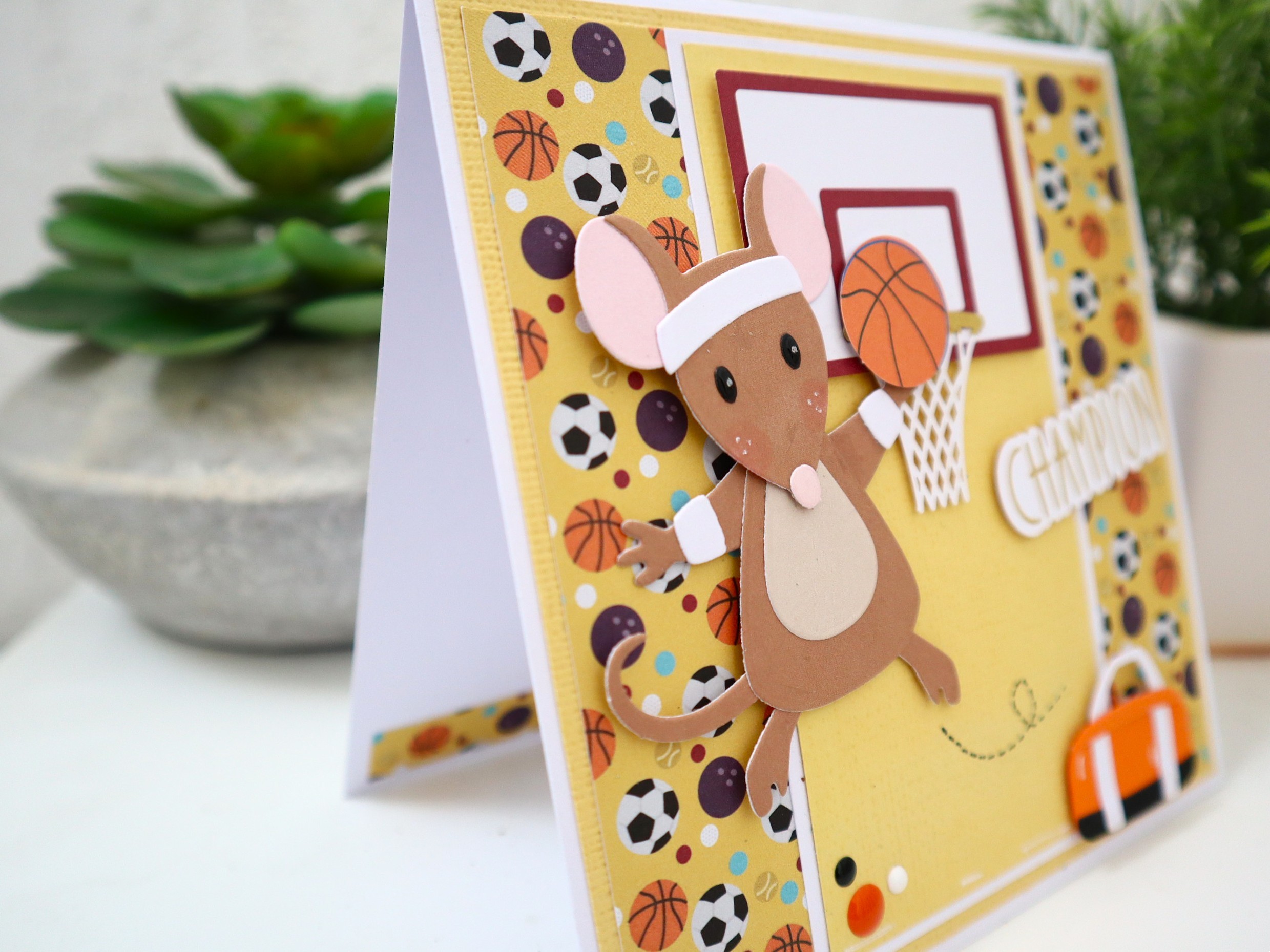 Des superpositions et des découpages de papiers cartonnés de différentes textures et imprimés ainsi que des jolis petits détails : montage en relief de la souris et du panneau de basket, petite étiquette "CHAMPION", demi perles noire, blanche et orange, etc... apportent un effet très chouette à cette jolie carte qui peut très bien devenir une petite décoration très sympathique !