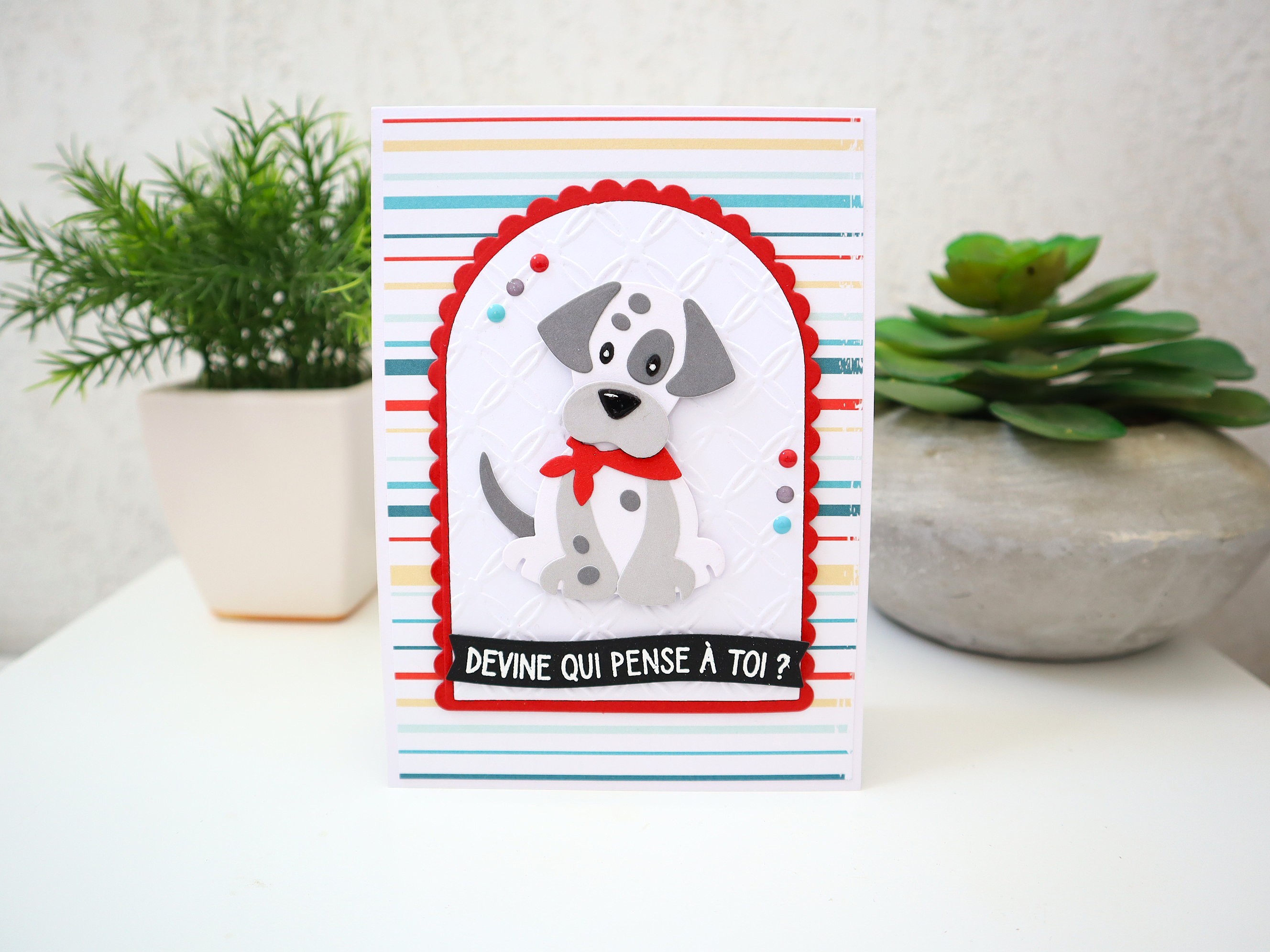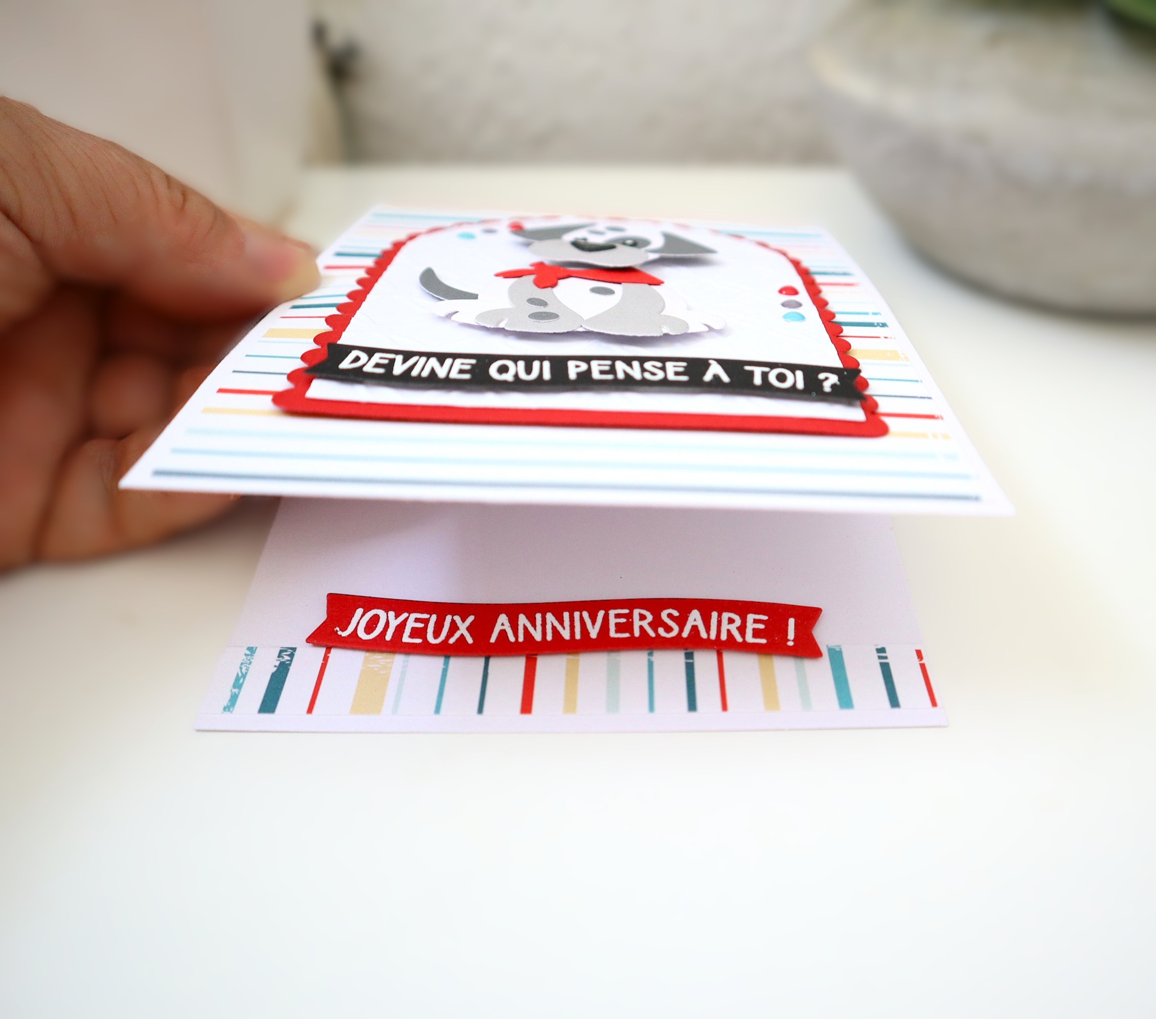 Des superpositions et des découpages de papiers cartonnés de différentes textures et imprimés ainsi que des jolis petits détails : montage en relief du chien, embossage en relief du fond blanc, demi perles rouge, gris, bleu, étiquette "Joyeux anniversaire" à l'intérieur de la carte, etc... apportent un effet très chouette à cette jolie carte qui peut très bien devenir une petite décoration très sympathique !