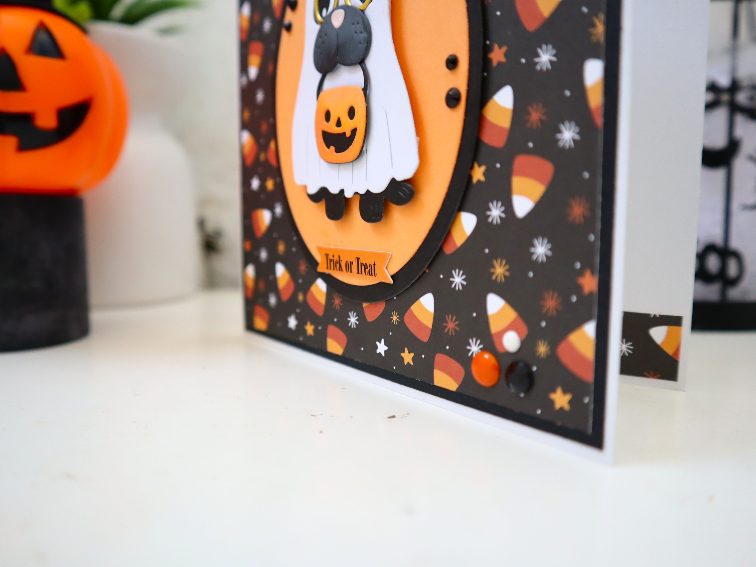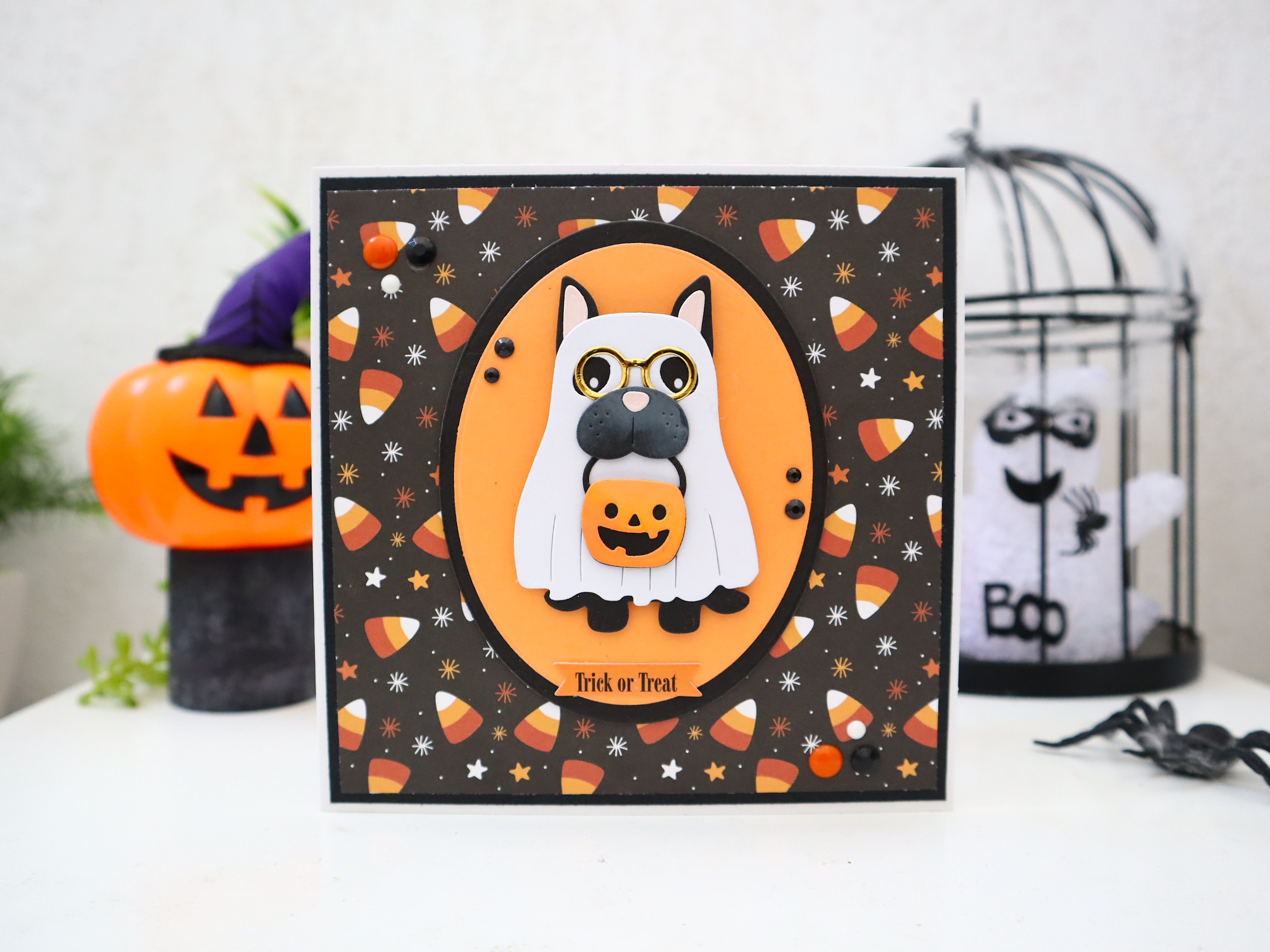Des superpositions et des découpages de papiers cartonnés de différentes textures et imprimés ainsi que des jolis petits détails : montage en relief du chien et de son panier, étiquette "Trick or Treat", papier doré pour les lunettes, demi perles noires, etc... apportent un effet très chouette à cette jolie carte qui peut très bien devenir une petite décoration d'Halloween très sympathique !