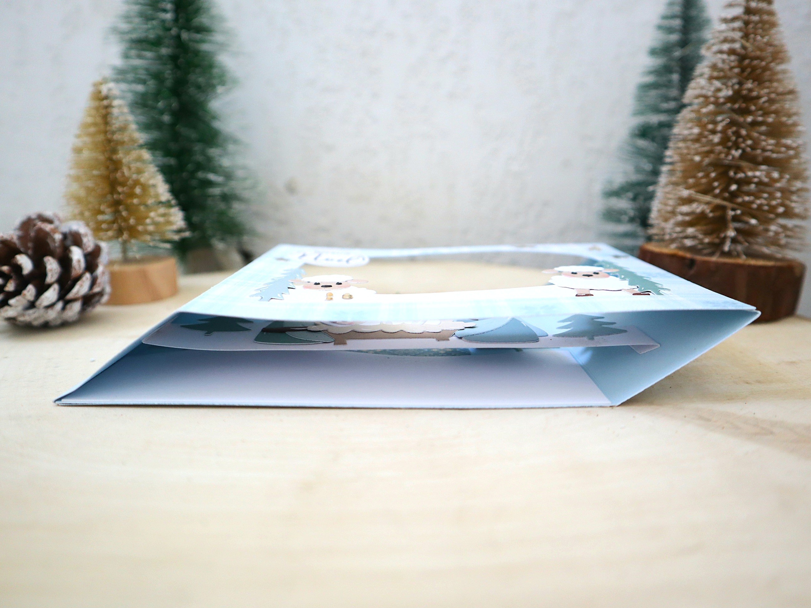 Beaucoup d'originalité et de douceur pour cette jolie carte de noël représentant la nativité. Une petite crèche moderne toute en simplicité avec Joseph, Marie, l'enfant Jésus et deux petits moutons. Carte-vitrine 3D vraiment très originale, entièrement réalisée main. Bien à plat dans son enveloppe, la carte prendra tous son volume une fois sortie.