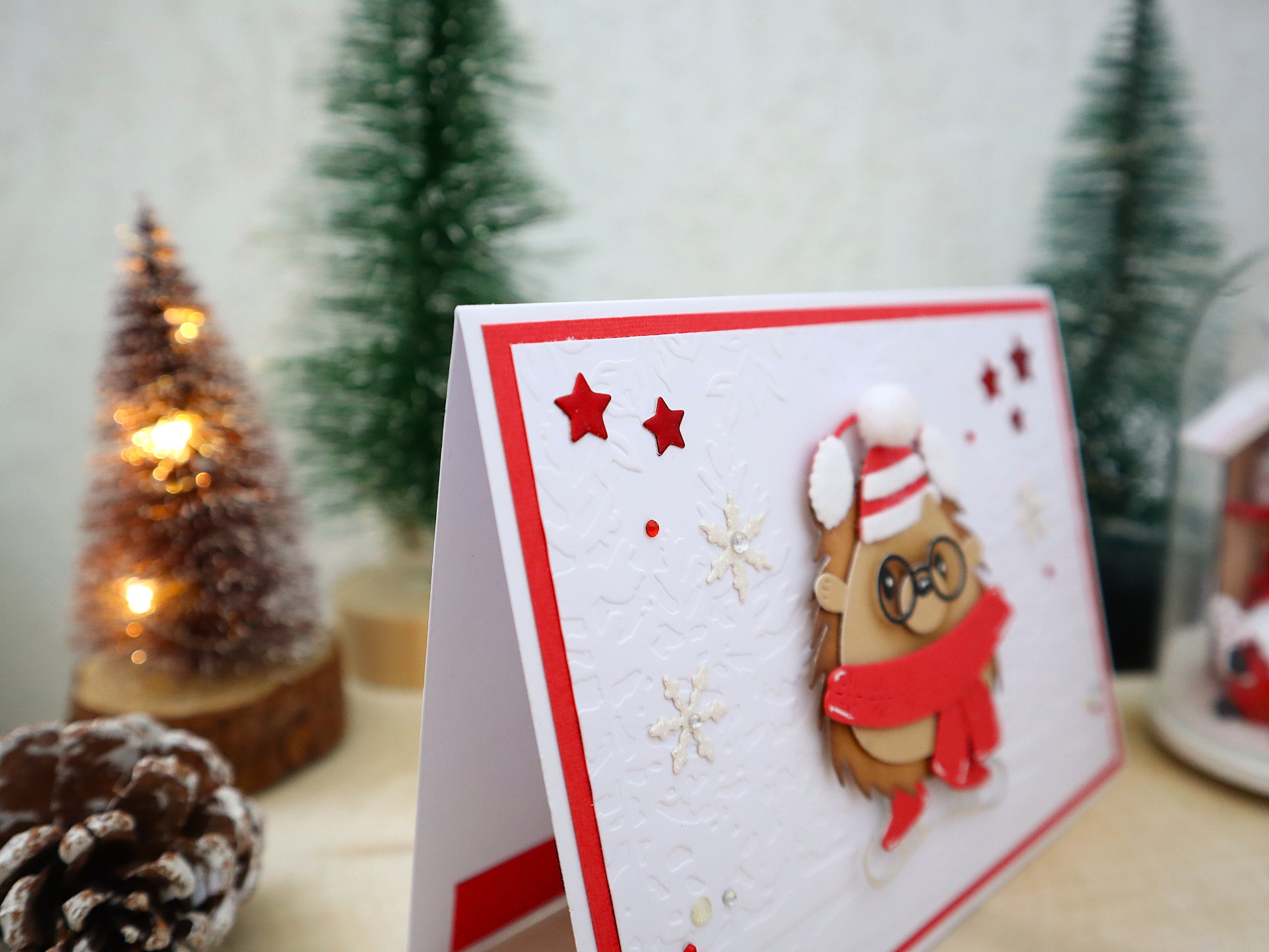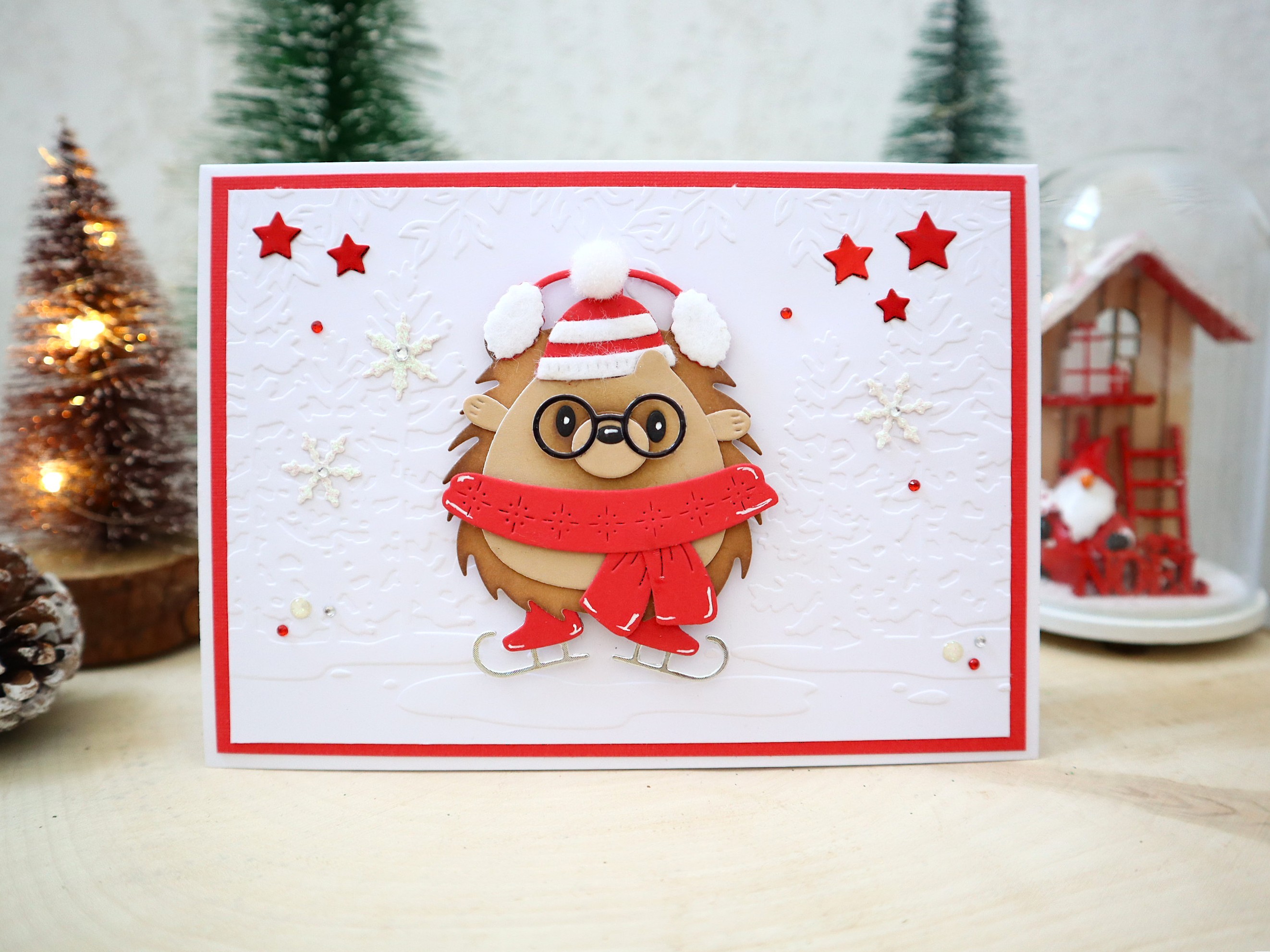 Des superpositions et des découpages de papiers cartonnés de différentes textures et imprimés ainsi que des jolis petits détails : montage 3D du hérisson, embossage de sapins sur le fond blanc, pompon blanc sur le bonnet, feutrine blanche pout le cache oreilles et les bandes du bonnet, papier argenté pour les lames des patins à glace, papier glitter irisé pour les flocons, papier métallisé rouge pour les étoiles, petits strass rouges et argentés, demi perles blanches irisées, inscription "Joyeux Noël et Bonne Année" en blanc vernis, etc... apportent un effet très chouette à cette jolie carte qui peut très bien devenir une petite décoration de noël très chic et sympathique !