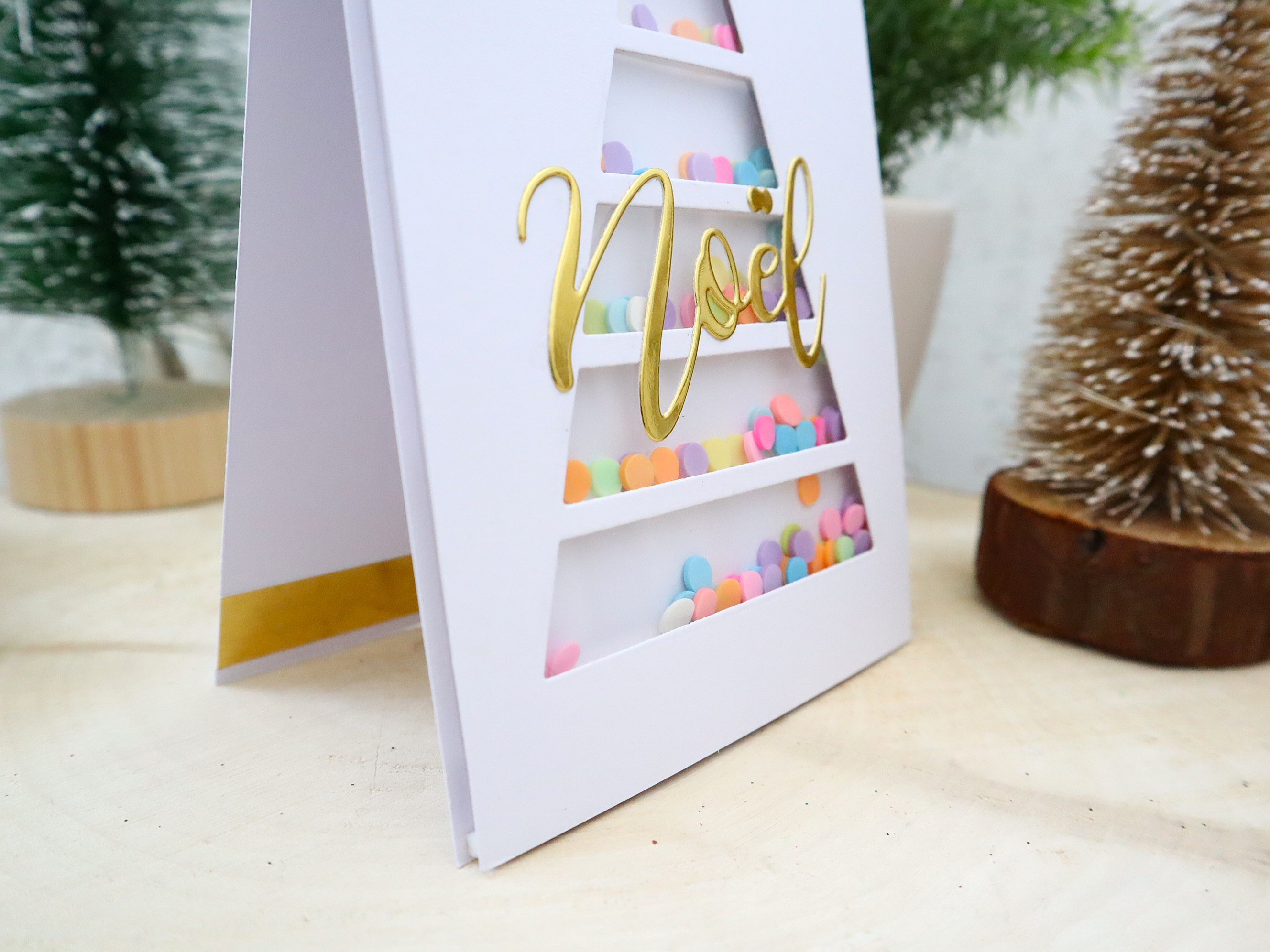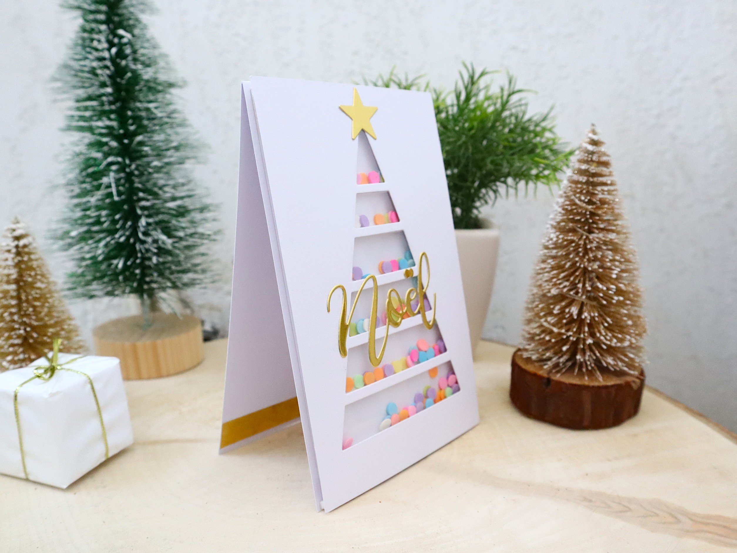 Un sapin de noël très moderne pour cette très jolie carte de noël 3D shaker vraiment très originale, entièrement réalisée main. Une carte très épurée pour un maximum de modernité et de chic !