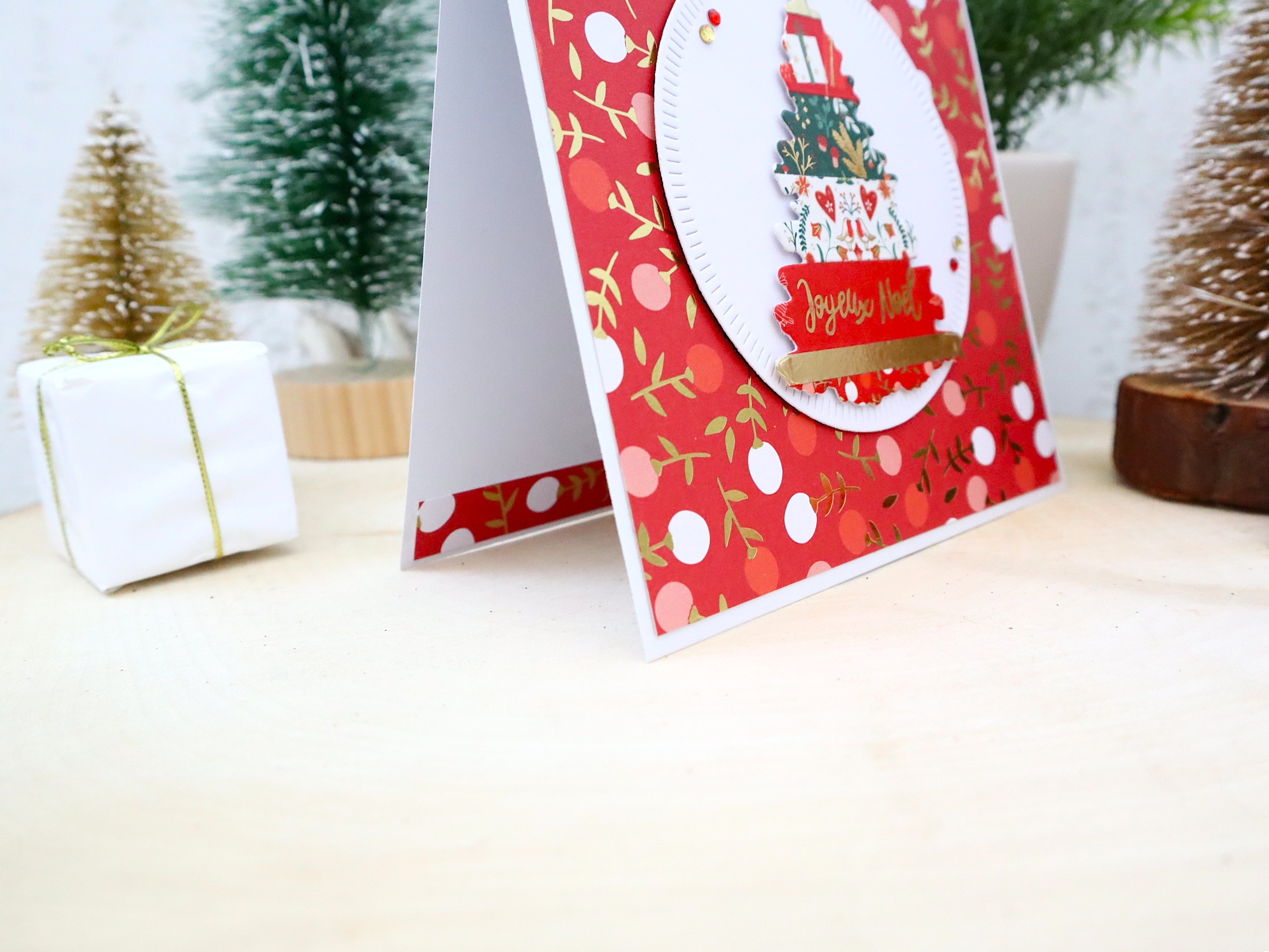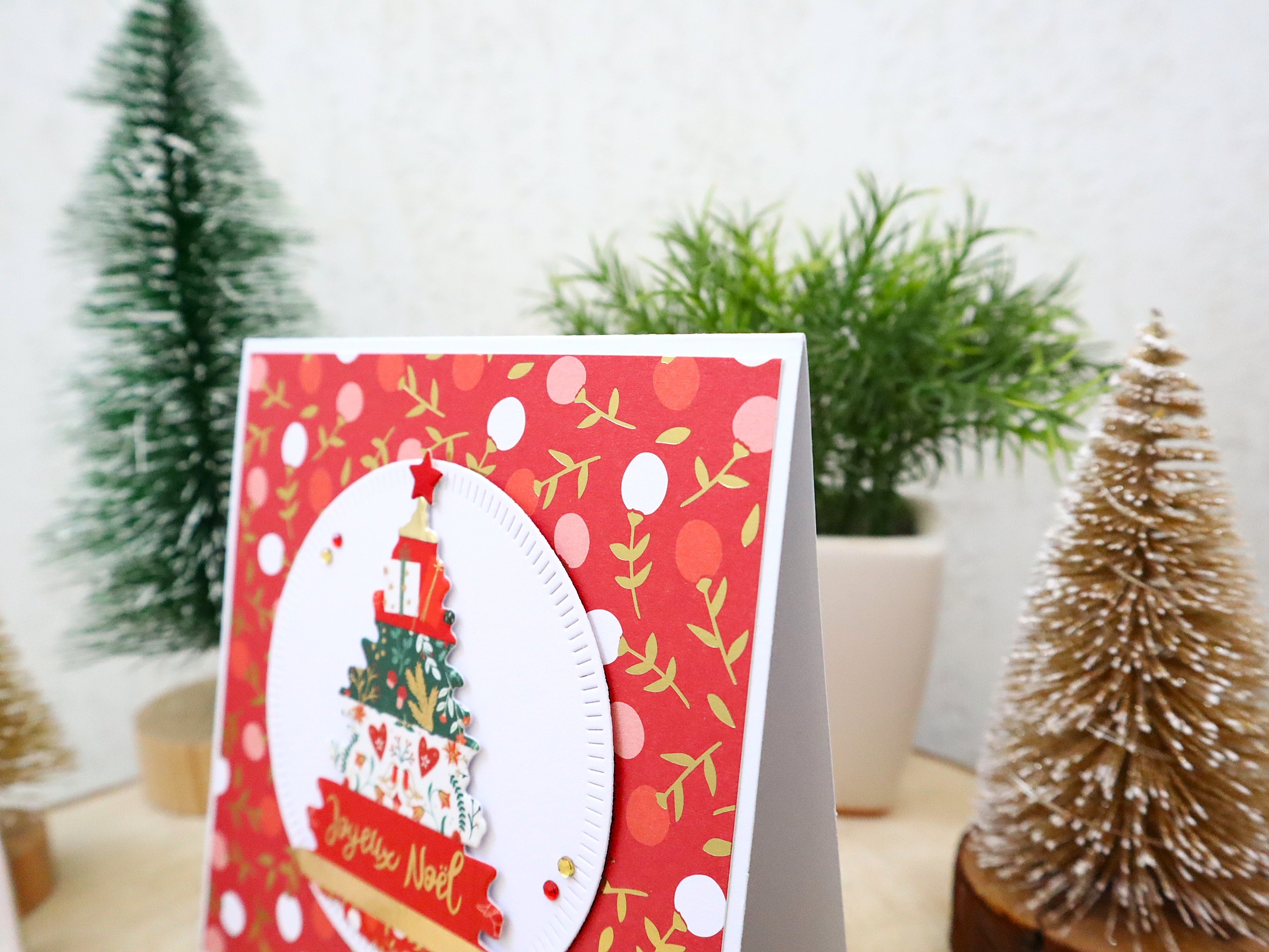 Des superpositions et des découpages de papiers cartonnés de différentes textures et imprimés ainsi que des jolis petits détails : montage 3D du sapin sur le devant de la carte, utilisation de bandes de papiers washi pour le sapin, papier miroir rouge pour l'étoile, petits strass dorés et rouges, etc... apportent un effet très chouette à cette jolie carte qui peut très bien devenir une petite décoration de noël très chic et sympathique !