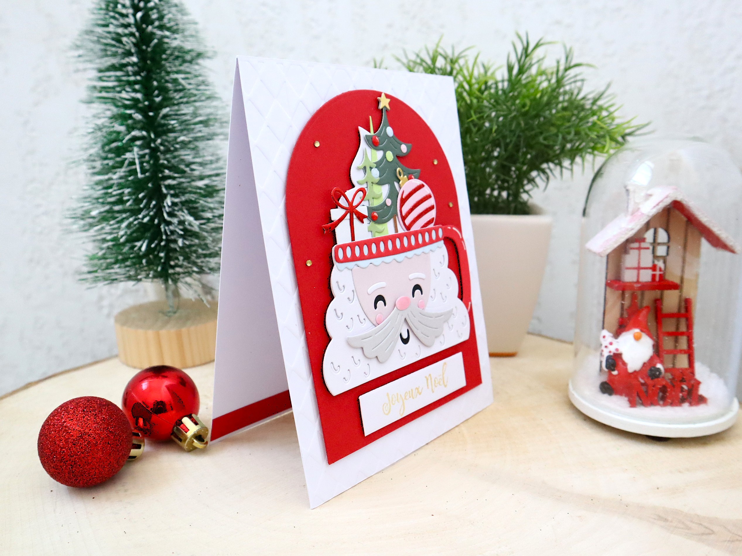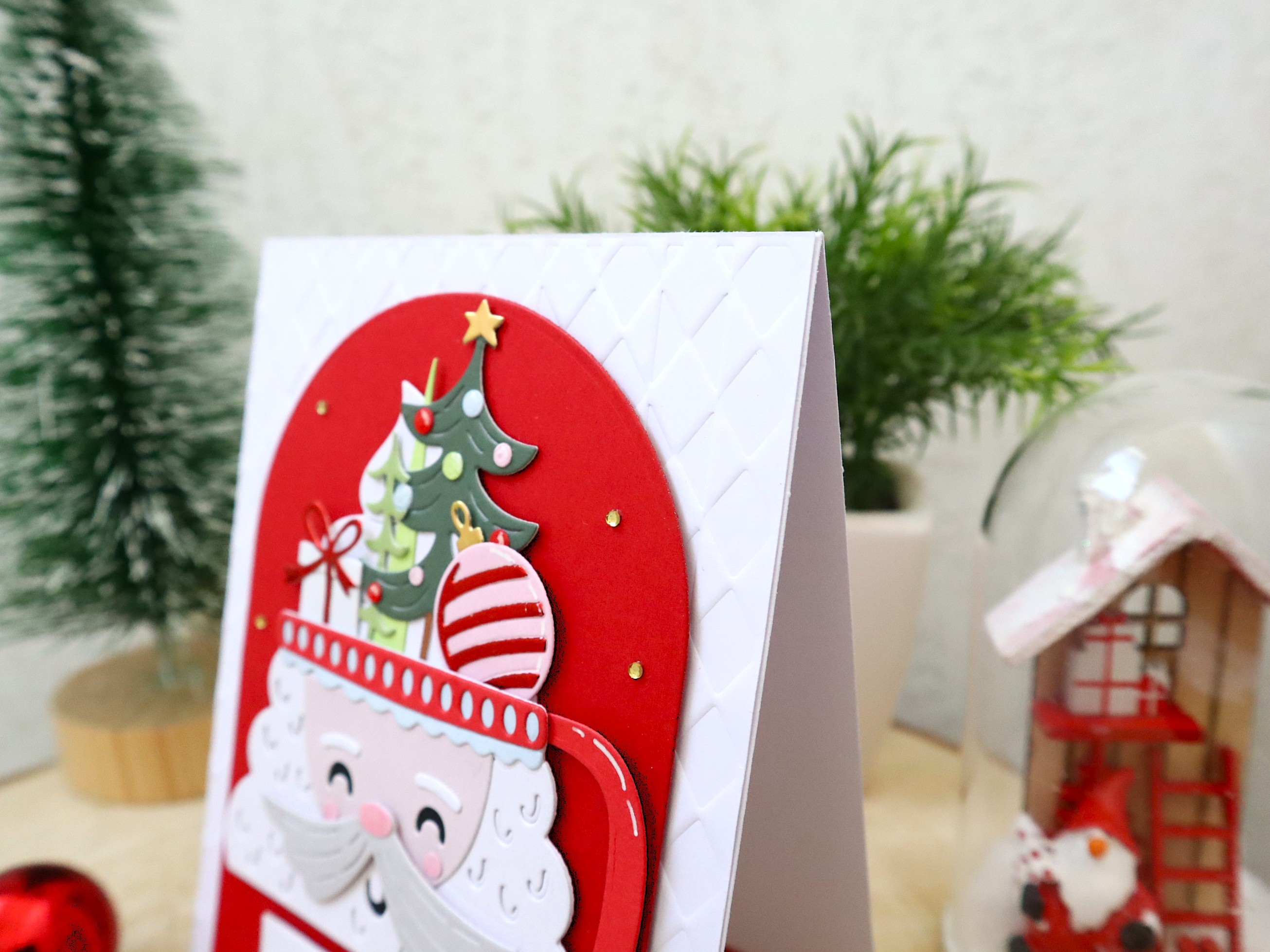 Des superpositions et des découpages de papiers cartonnés de différentes textures et imprimés ainsi que des jolis petits détails : montage 3D du mug, embossage en relief du panneau blanc, papier miroir rouge pour les décorations, et doré pour l'étoile, petits strass doré, etc... apportent un effet très chouette à cette jolie carte qui peut très bien devenir une petite décoration de noël très sympathique !