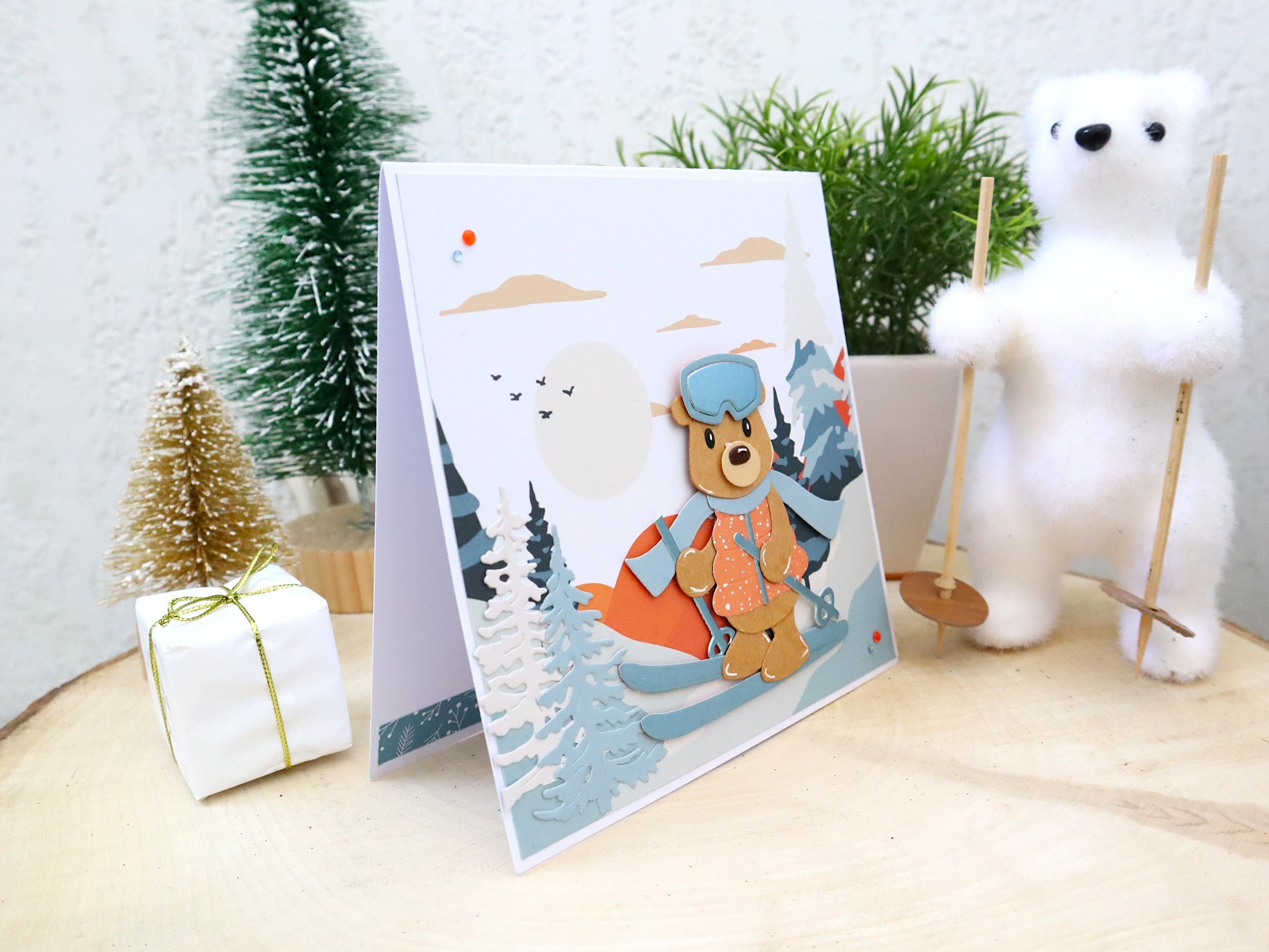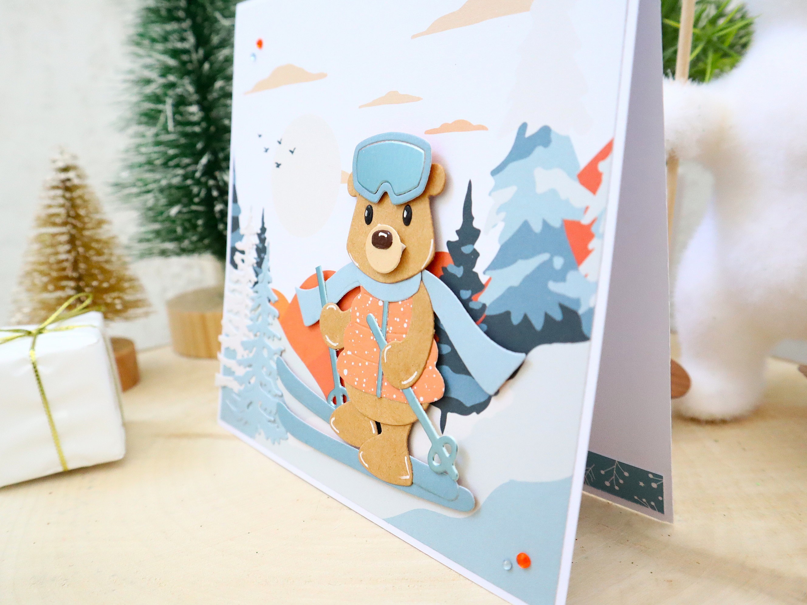 Des superpositions et des découpages de papiers cartonnés de différentes textures et imprimés ainsi que des jolis petits détails : montage 3D de l'ourson, papier miroir bleu pour le masque et les batons de ski, petits strass bleu et orange, etc... apportent un effet très chouette à cette jolie carte qui peut très bien devenir une petite décoration très sympathique !