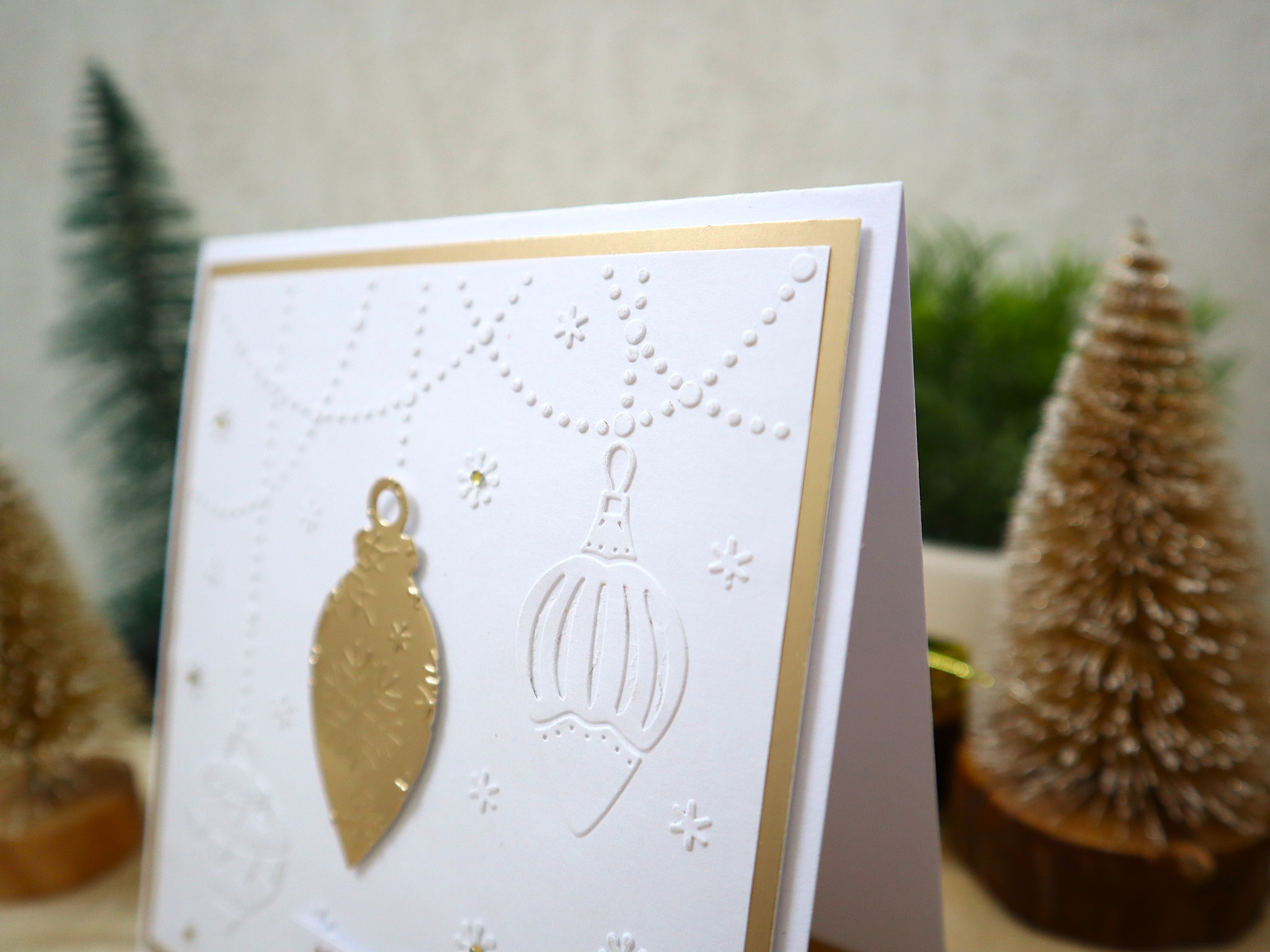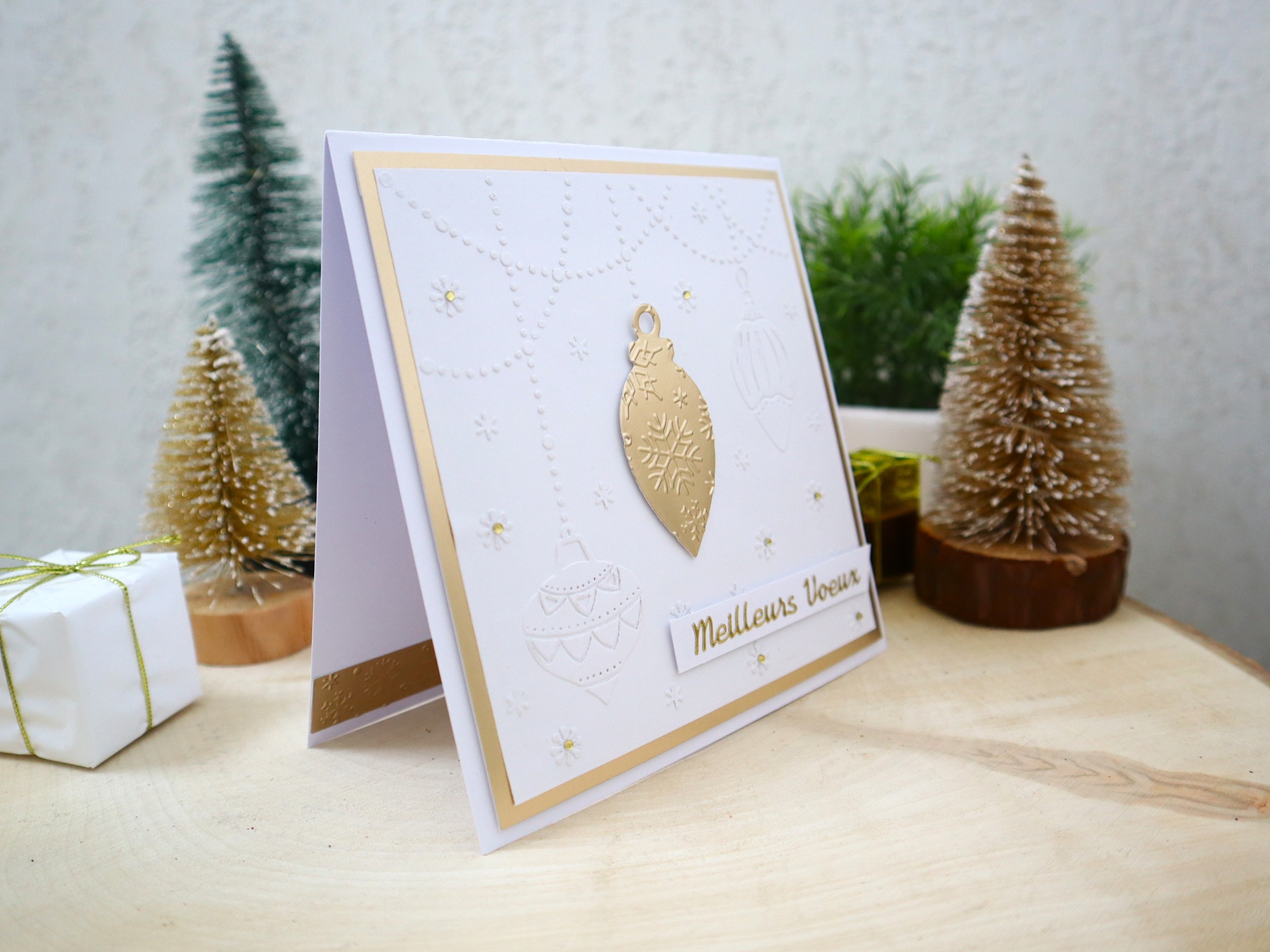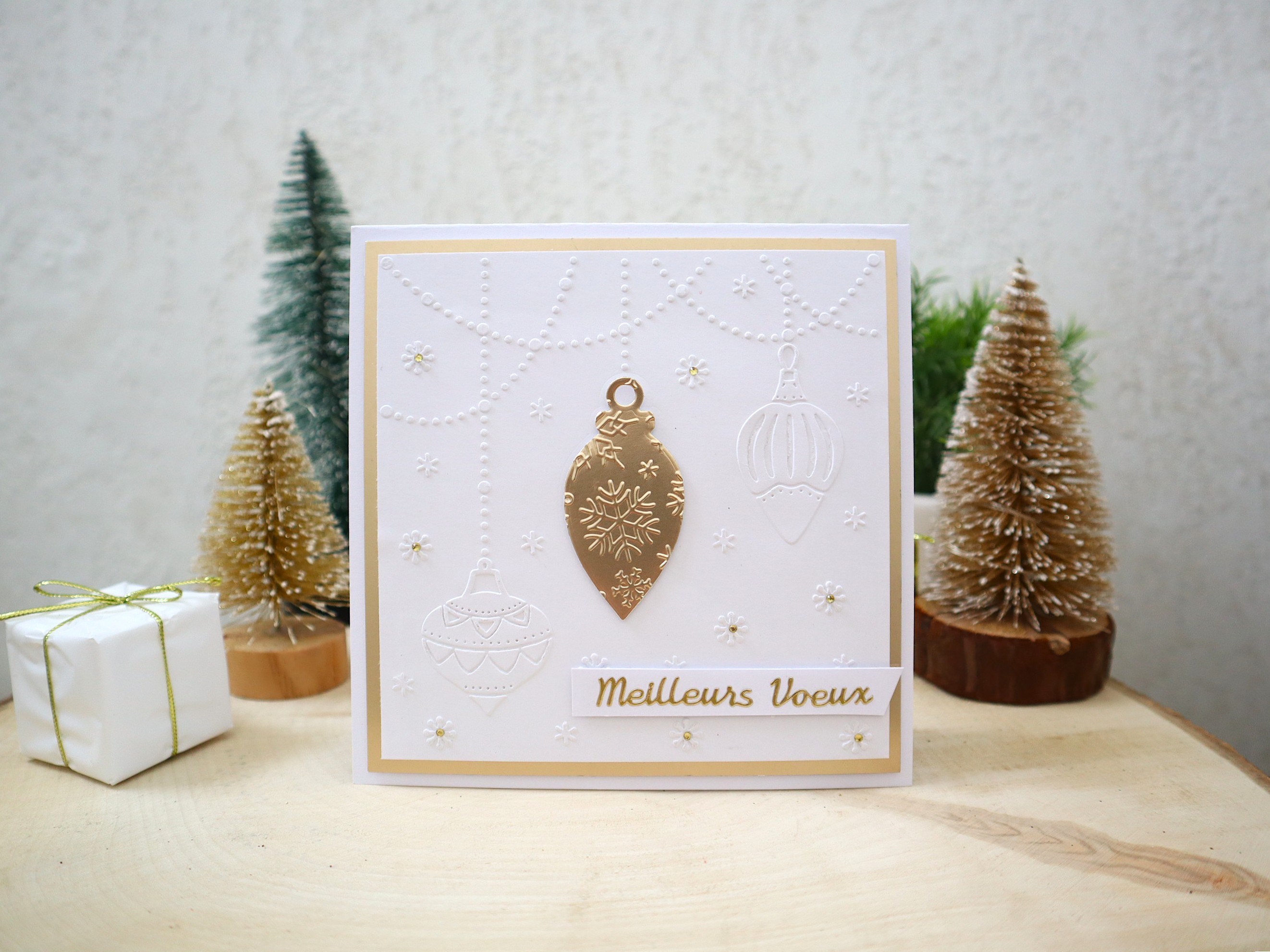Des superpositions et des découpages de papiers cartonnés de différentes textures et imprimés ainsi que des jolis petits détails : embossage de boules de noël et de guirlandes de perles sur le fond blanc, montage 3D de la boule centrale, papier miroir doré la boule avec embossage de motifs flocons, inscription "Meilleurs voeux" autocollant peel-off doré, petits strass dorés, etc... apportent un effet très chouette à cette jolie carte qui peut très bien devenir une petite décoration très sympathique !