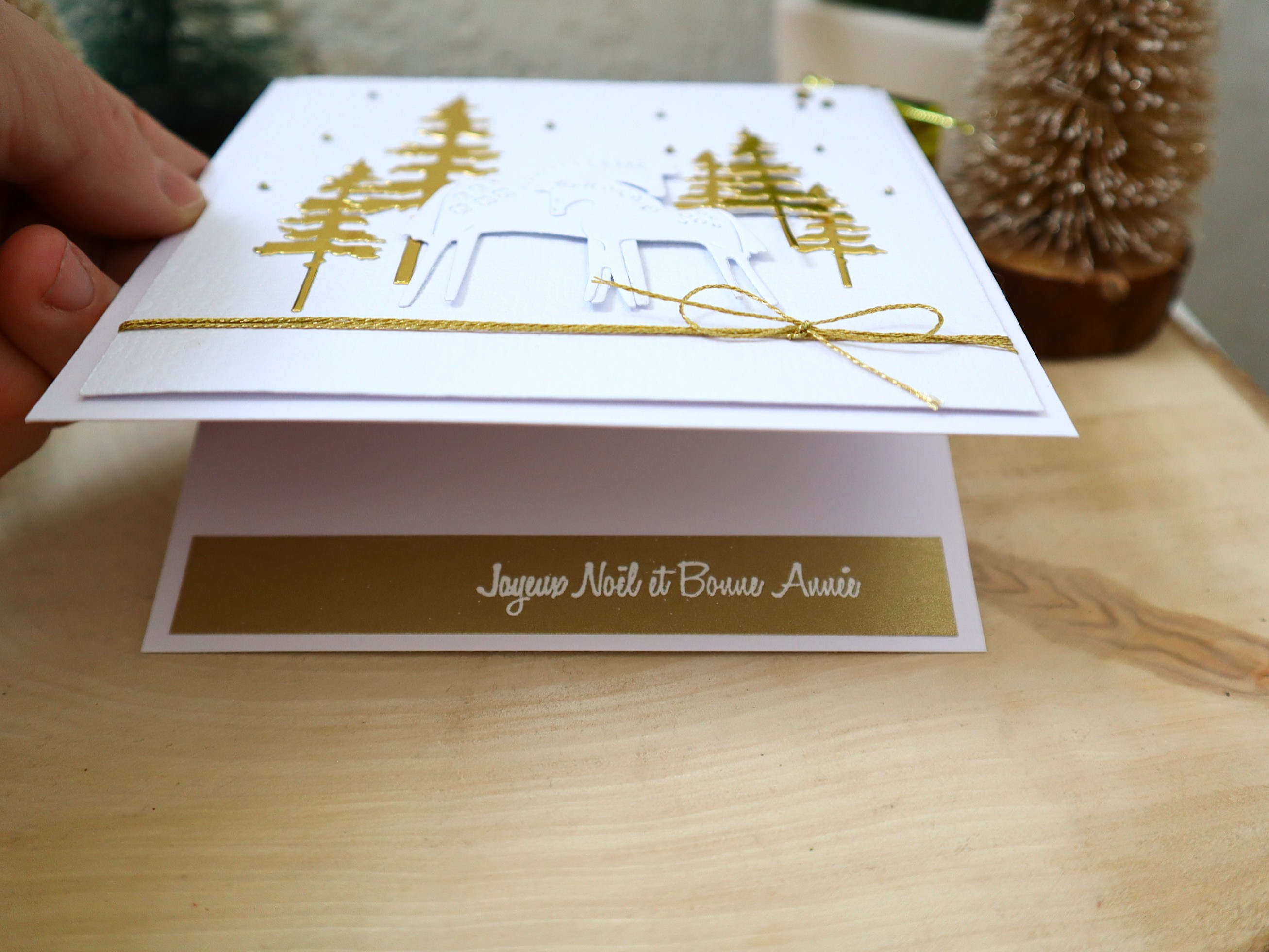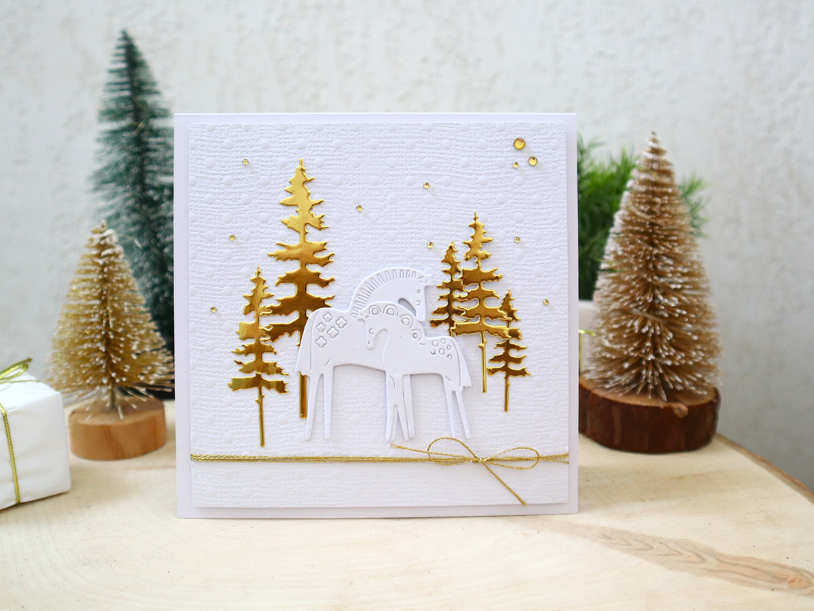 Des superpositions et des découpages de papiers cartonnés de différentes textures et imprimés ainsi que des jolis petits détails : papier blanc structuré, montage 3D des chevaux, papier miroir doré pour les sapins, petits strass dorés, petits fils et noeud dorés, etc... apportent un effet très chouette à cette jolie carte qui peut très bien devenir une petite décoration très sympathique !