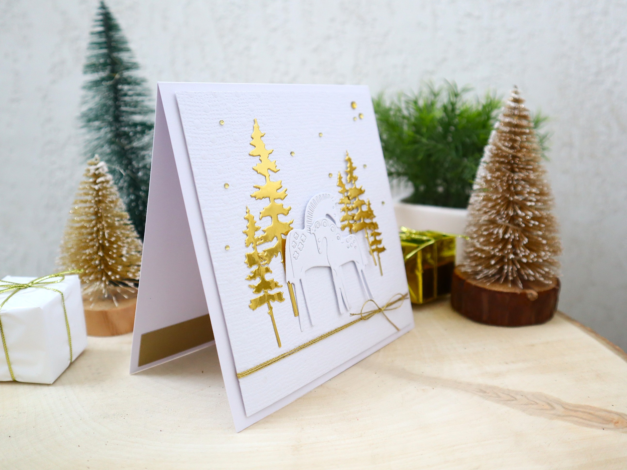 Une superbe carte de noël ou voeux très raffinée avec de magnifiques chevaux style scandinave et des sapins dorés. Une carte de voeux 3D entièrement réalisée main.