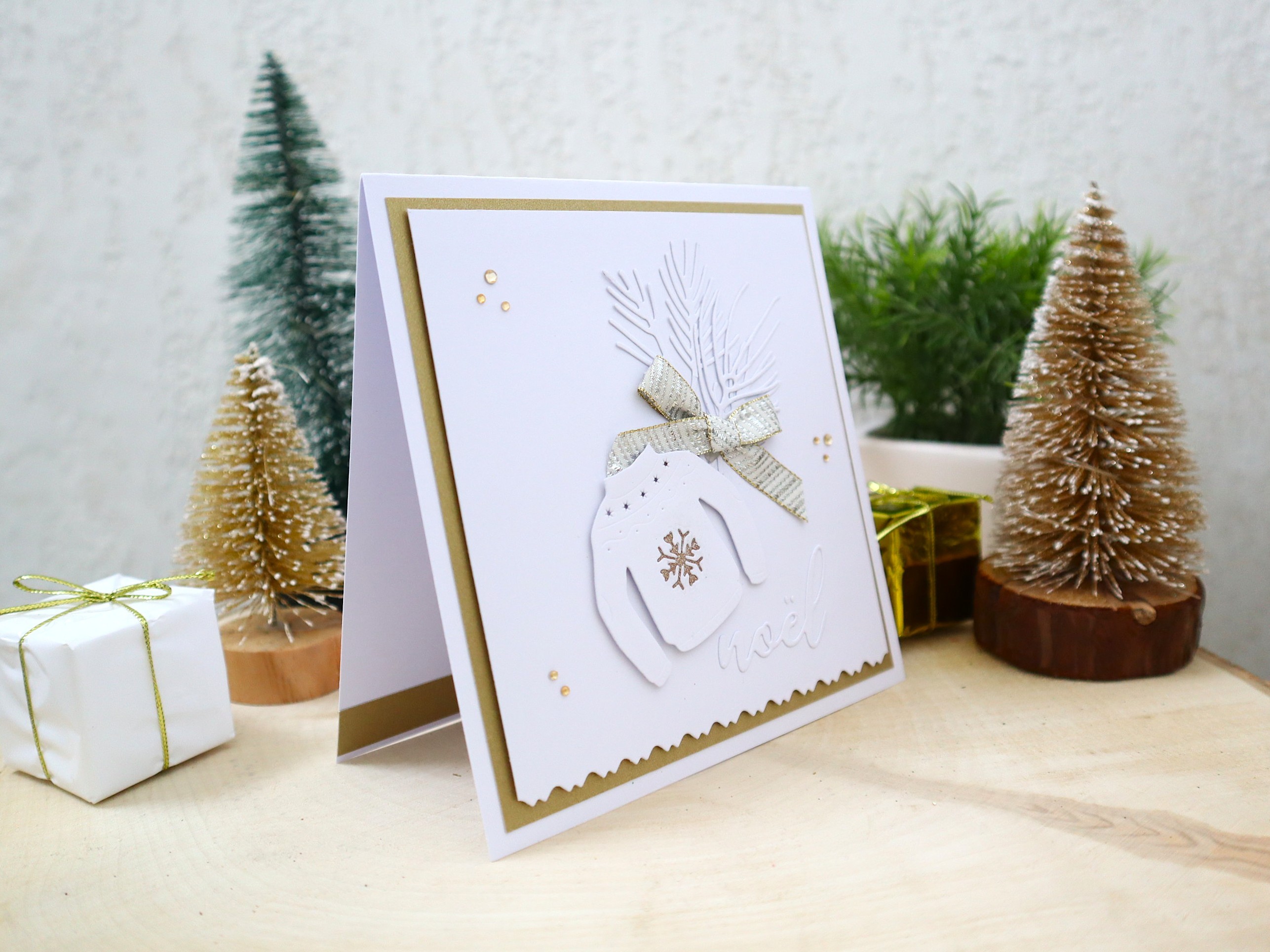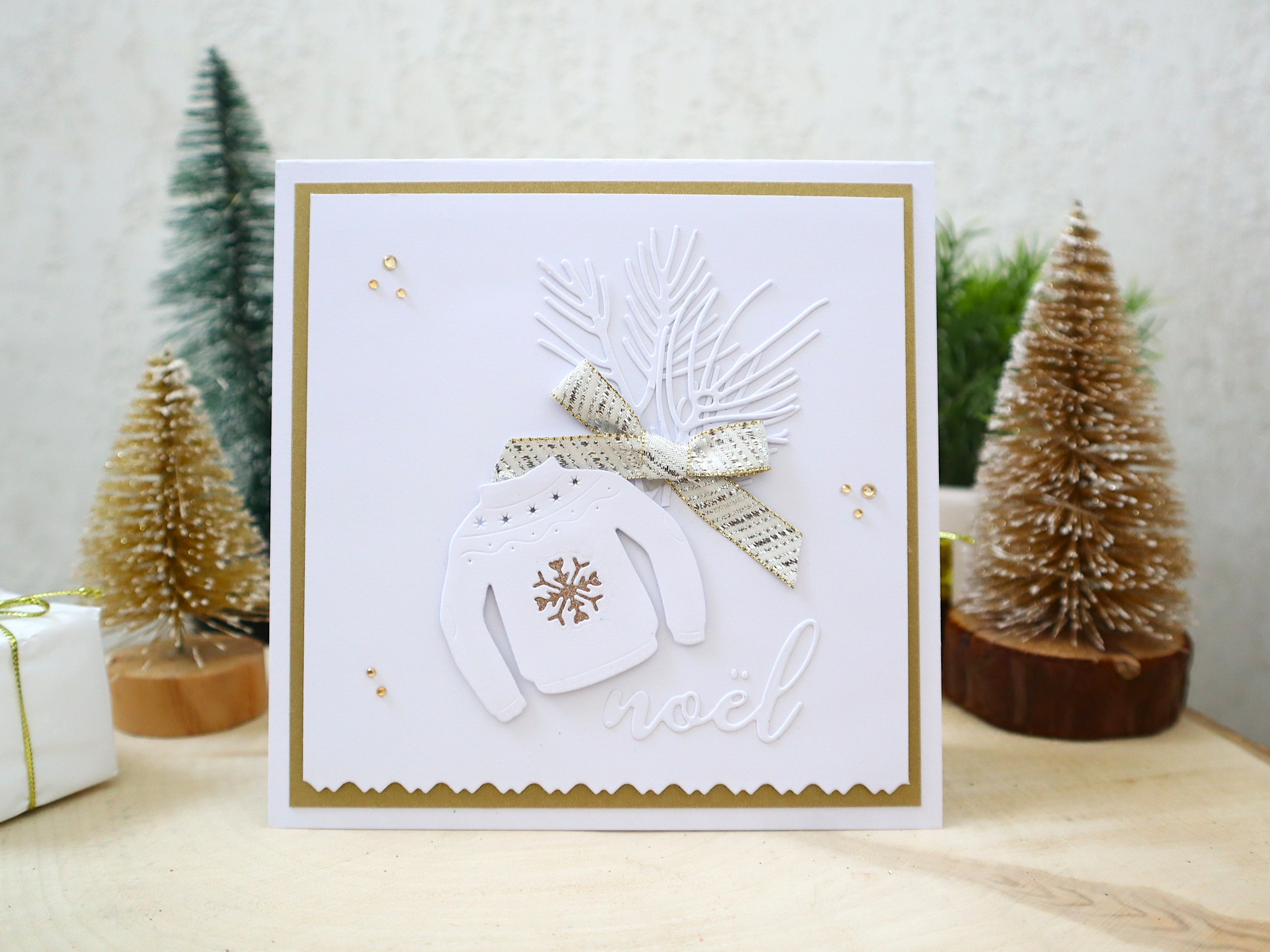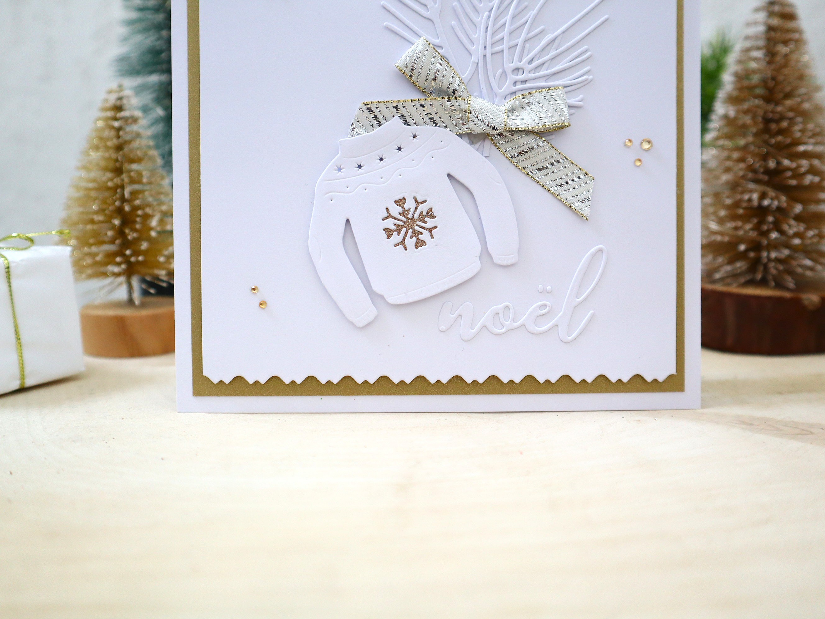 Des superpositions et des découpages de papiers cartonnés de différentes textures et imprimés ainsi que des jolis petits détails : montage 3D du pull, branches de sapin en blanc ton sur ton, ruban tissu or et argenté, inscription noël en relief, petits strass dorés, etc... apportent un effet très chouette à cette jolie carte qui peut très bien devenir une petite décoration très sympathique !