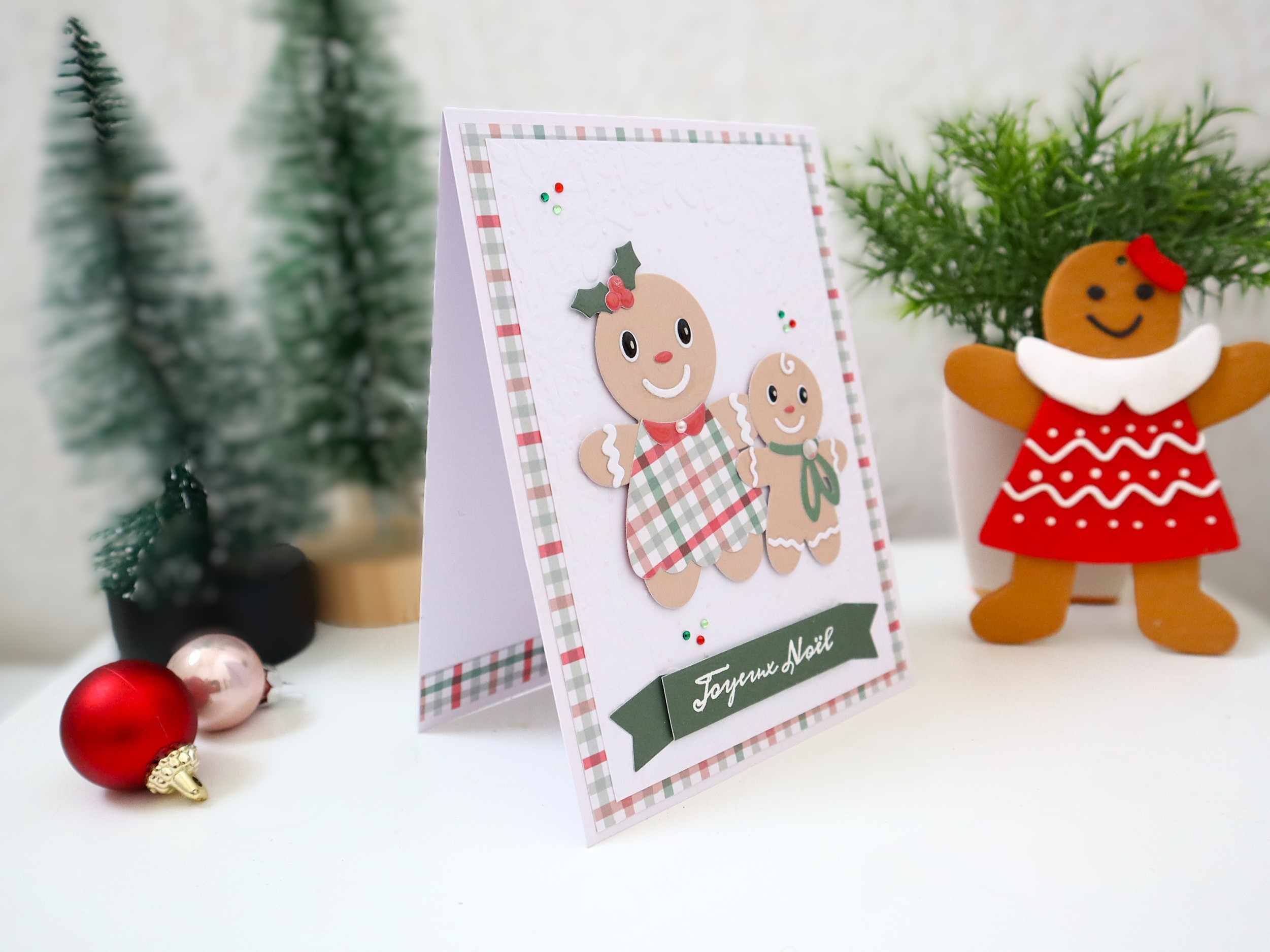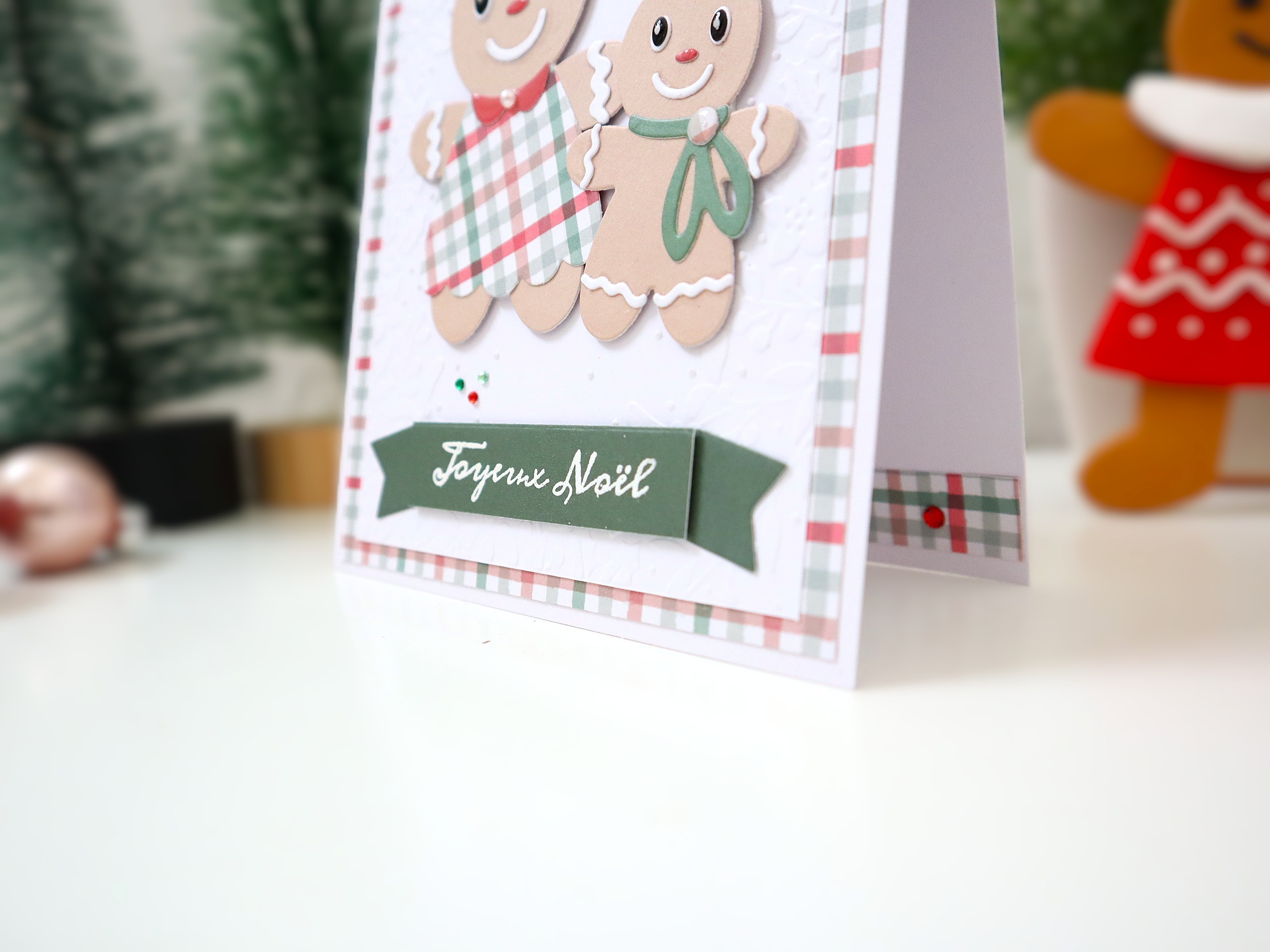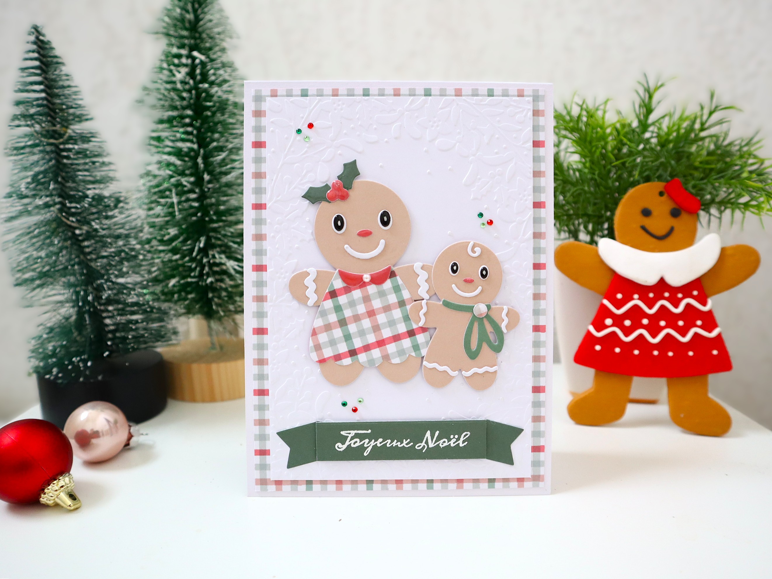 Un adorable duo de bonhommes en pain d'épices en tenue de noël pour une superbe carte de noël 3D entièrement réalisée main.