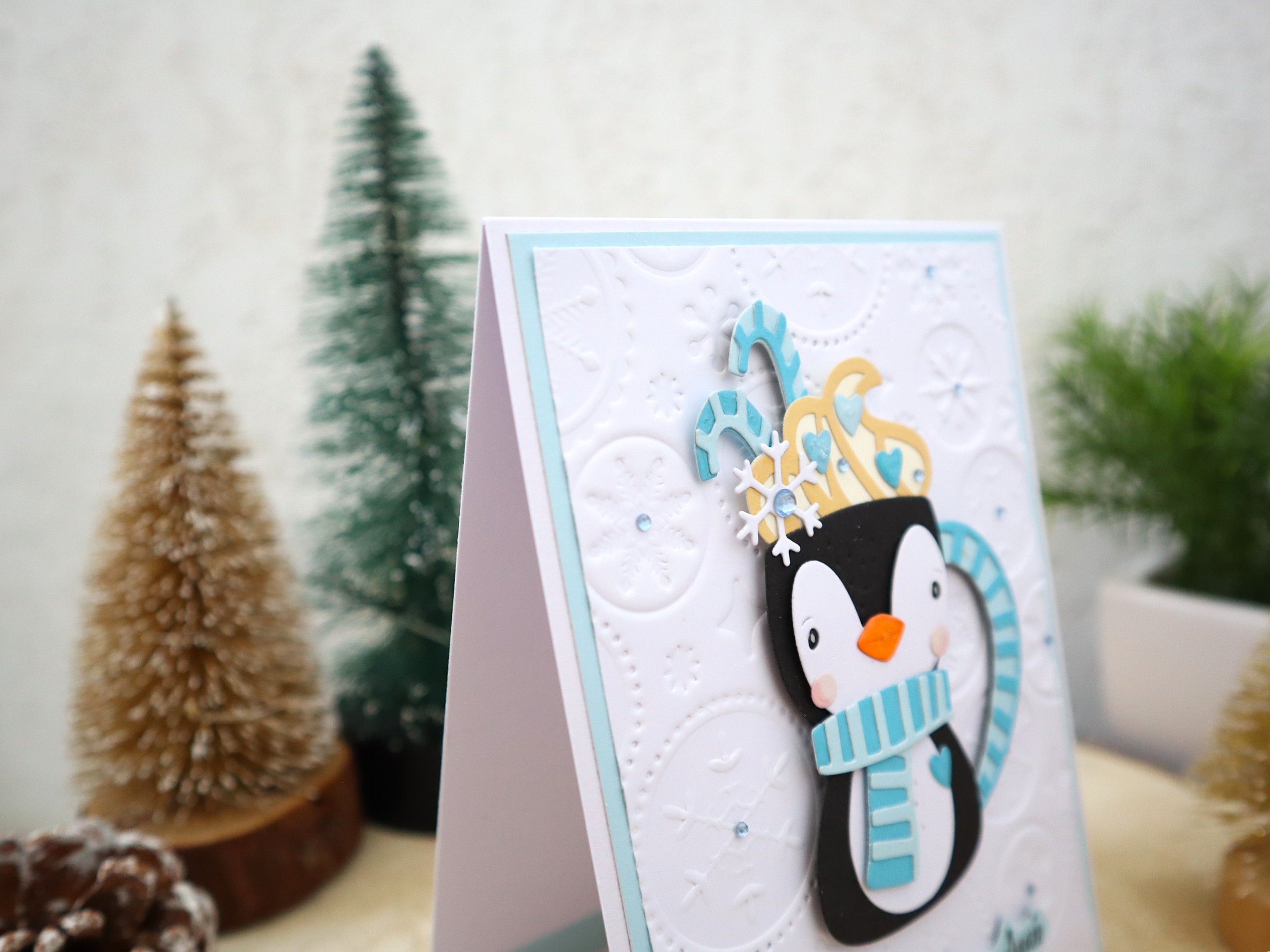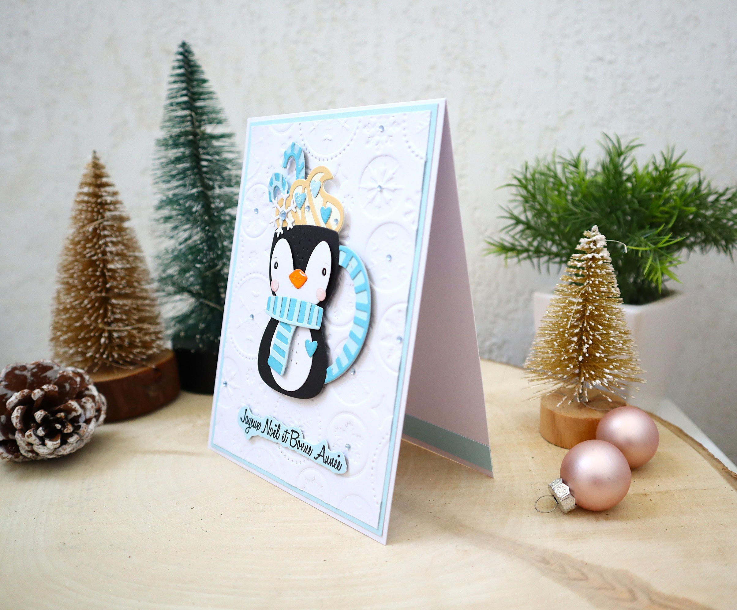 Des superpositions et des découpages de papiers cartonnés de différentes textures et imprimés ainsi que des jolis petits détails : montage 3D du pingouin, embossage motifs de noël sur le fond blanc, petits strass bleus, etc... apportent un effet très chouette à cette jolie carte qui peut très bien devenir une petite décoration très sympathique !