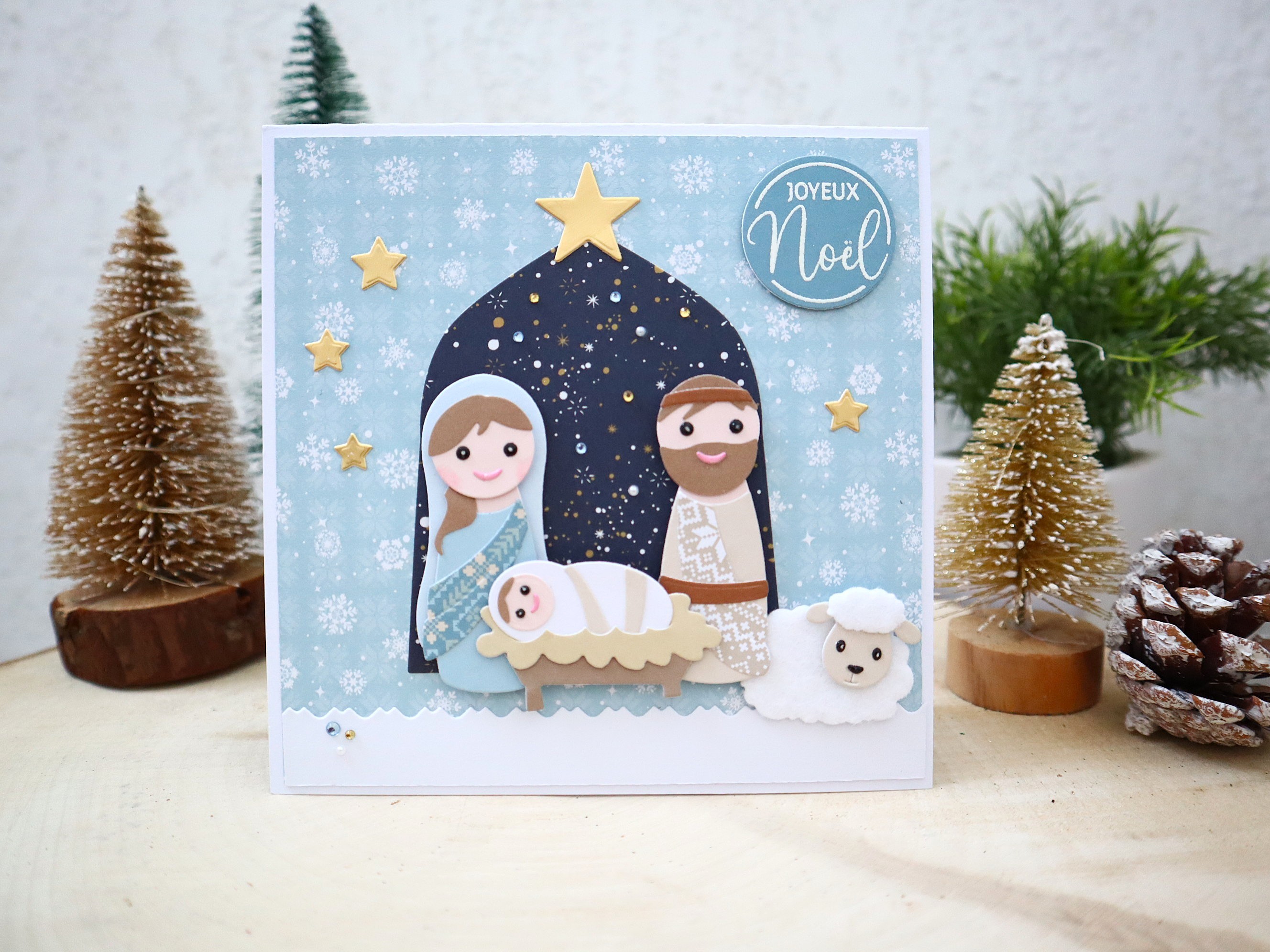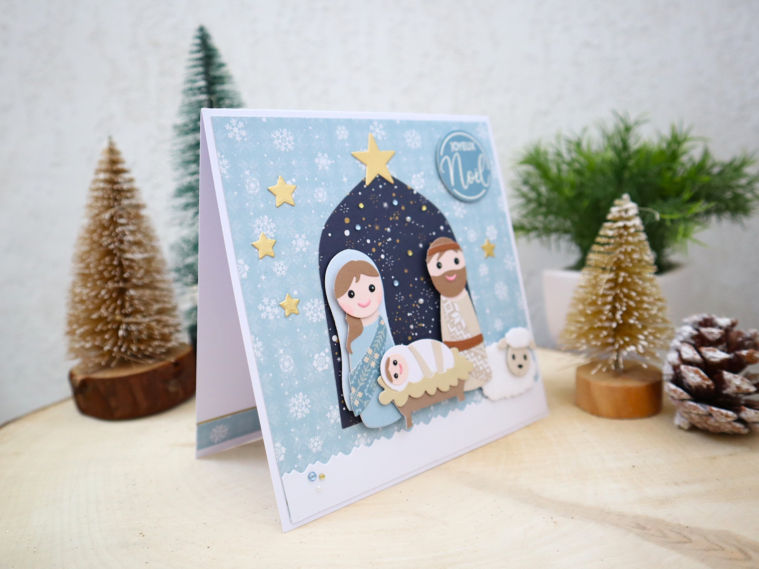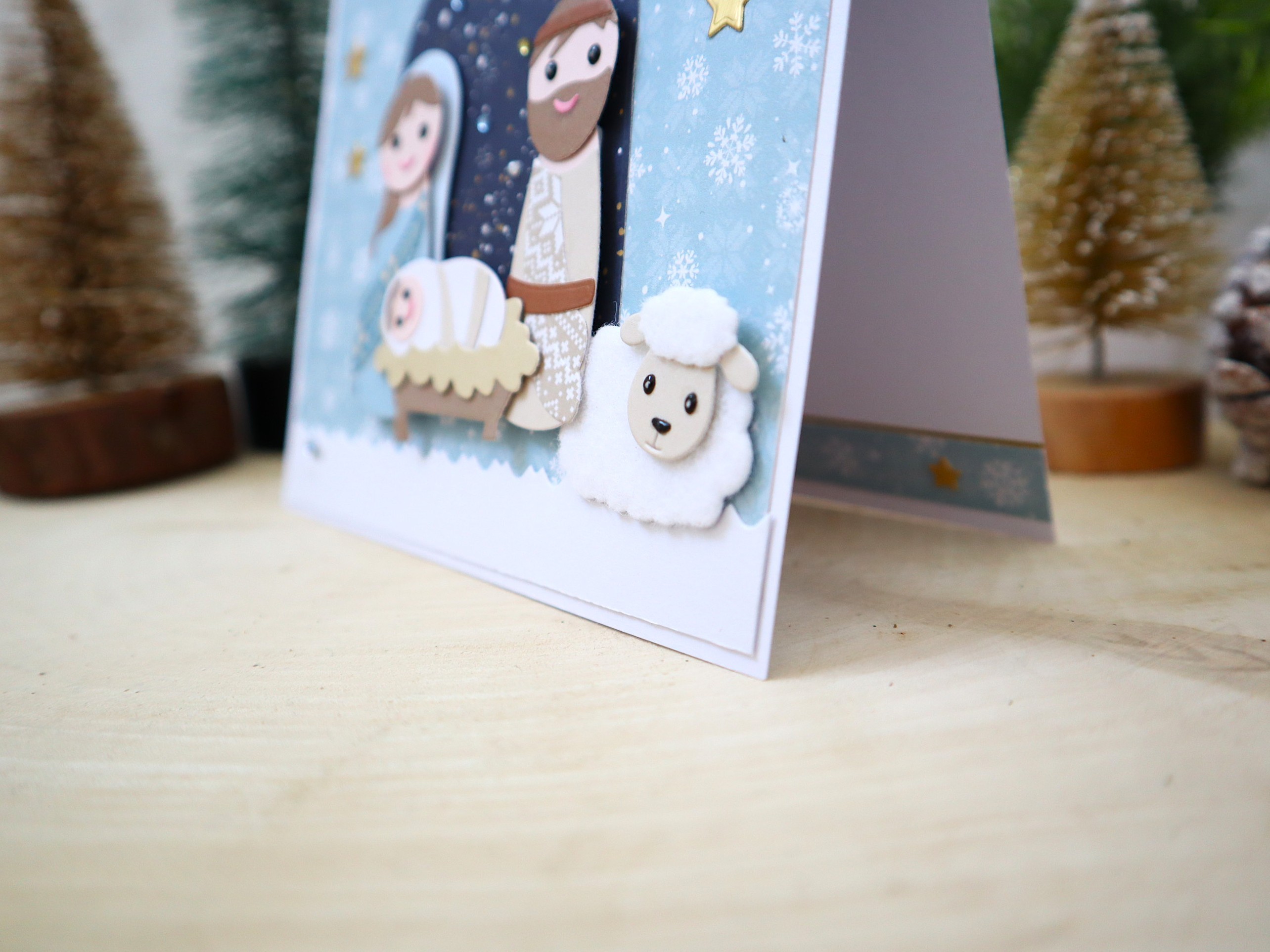 Des superpositions et des découpages de papiers cartonnés de différentes textures et imprimés ainsi que des jolis petits détails : montage 3D des personnages la carte, feutrine blanche pour le mouton, papier doré mat pour les étoiles, petits strass doré et bleu, demi perles blanches, etc... apportent un effet très chouette à cette jolie carte qui peut très bien devenir une petite décoration de noël très sympathique !