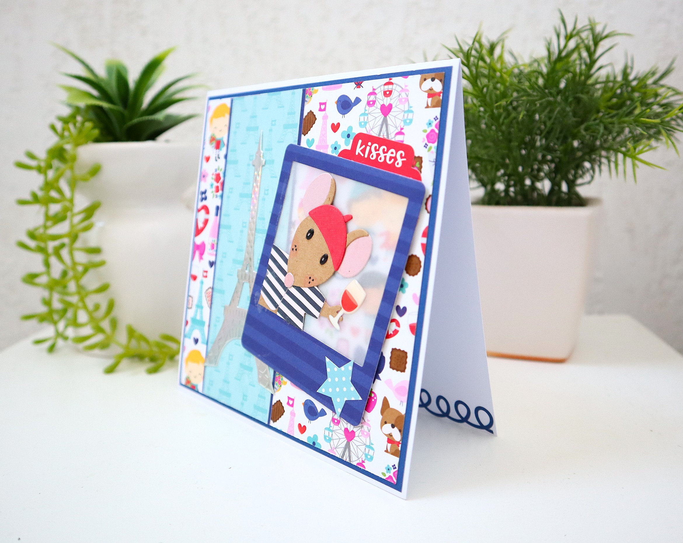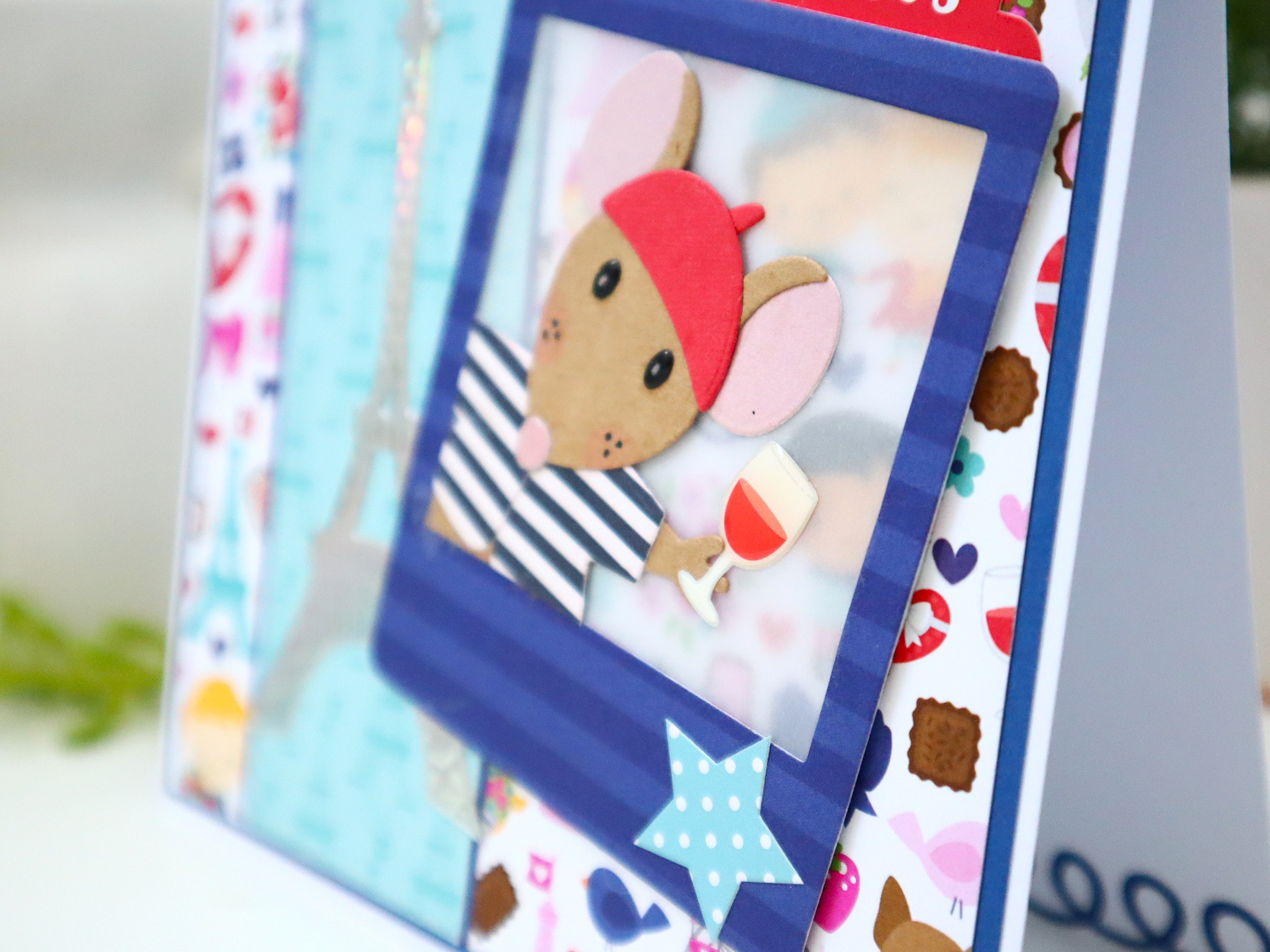 Des superpositions et des découpages de papiers cartonnés de différentes textures et imprimés ainsi que des jolis petits détails : montage en relief de la "photo", papier vellum pour l'arrière de la photo, papier métallisé argenté pour la tour Eiffel, le verre de vin est un autocollant en plastique, etc... apportent un effet très chouette à cette jolie carte qui peut très bien devenir une petite décoration très sympathique !