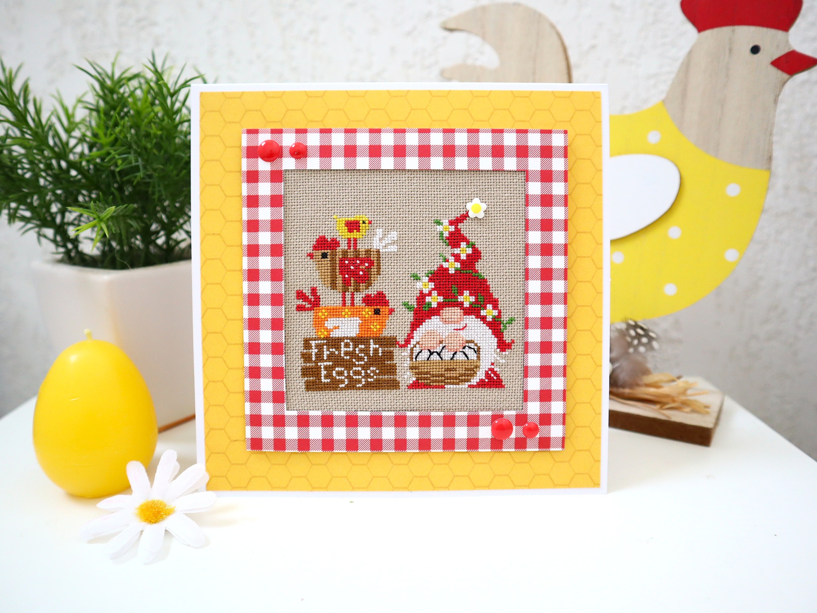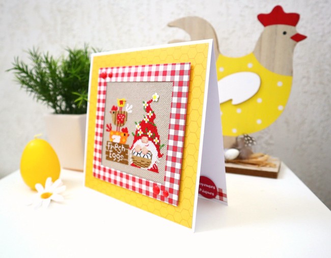 Un gnome au bonnet fleuri avec ses jolies poulettes et ses oeufs tout frais !!! Une superbe carte de Pâques très originale, entièrement brodée et réalisée main.