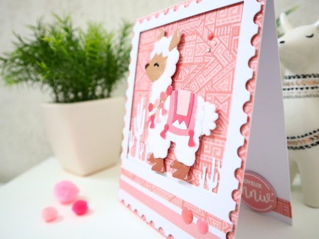 Cette carte est fabriquée à la main avec des superpositions de papiers design cartonnés de différentes textures et imprimés, des éléments détaillés découpés avec des matrices de découpe ainsi qu'une multitude de petits détails : Montage en relief effet 3D du lama, éléments irisés sur le papier design du fond, feutrine blanche toute douce pour le corps du lama, demi perles roses et blanches, mini strass argenté, etc... ce qui rend cette création vraiment spéciale et inédite.