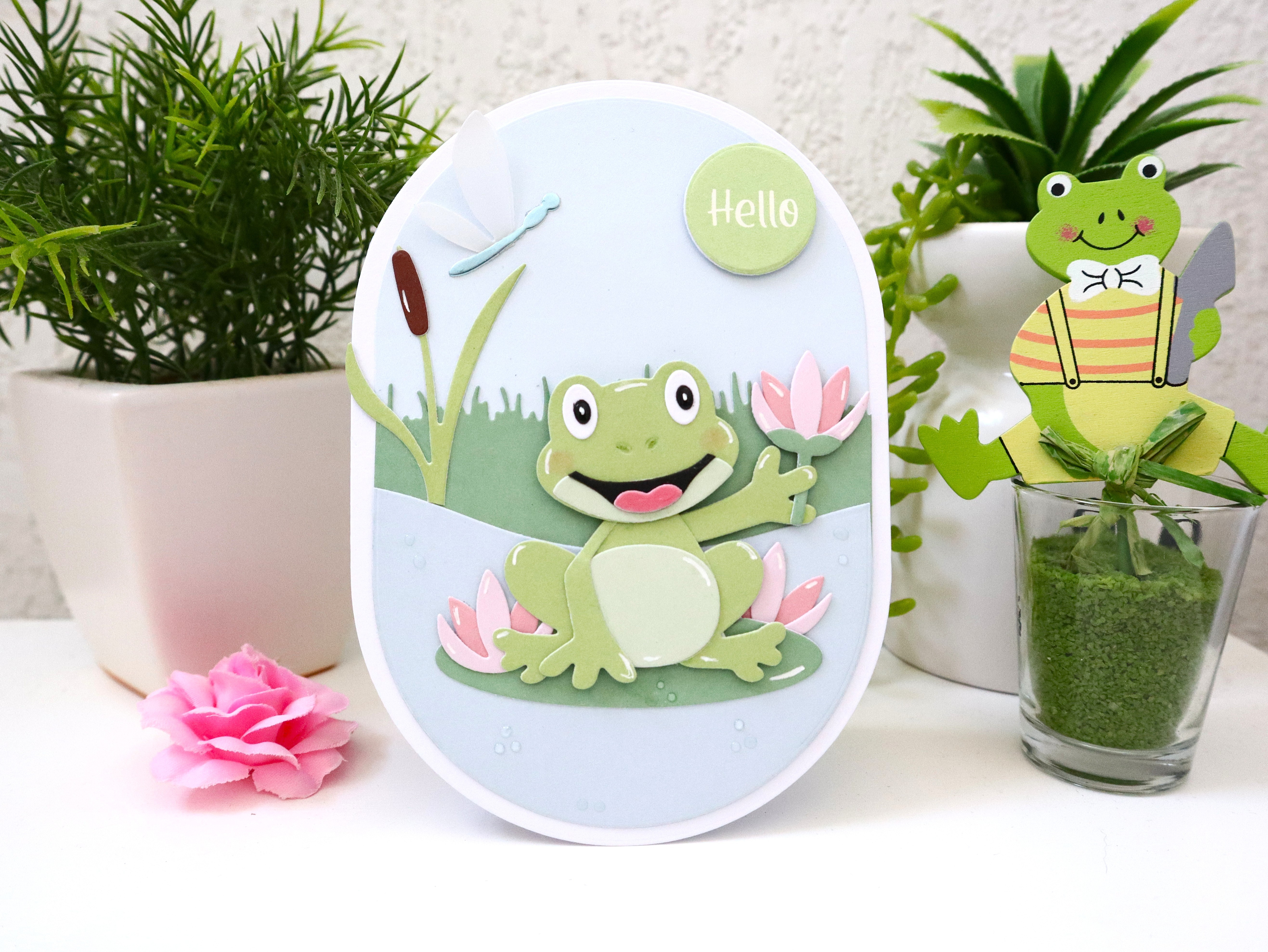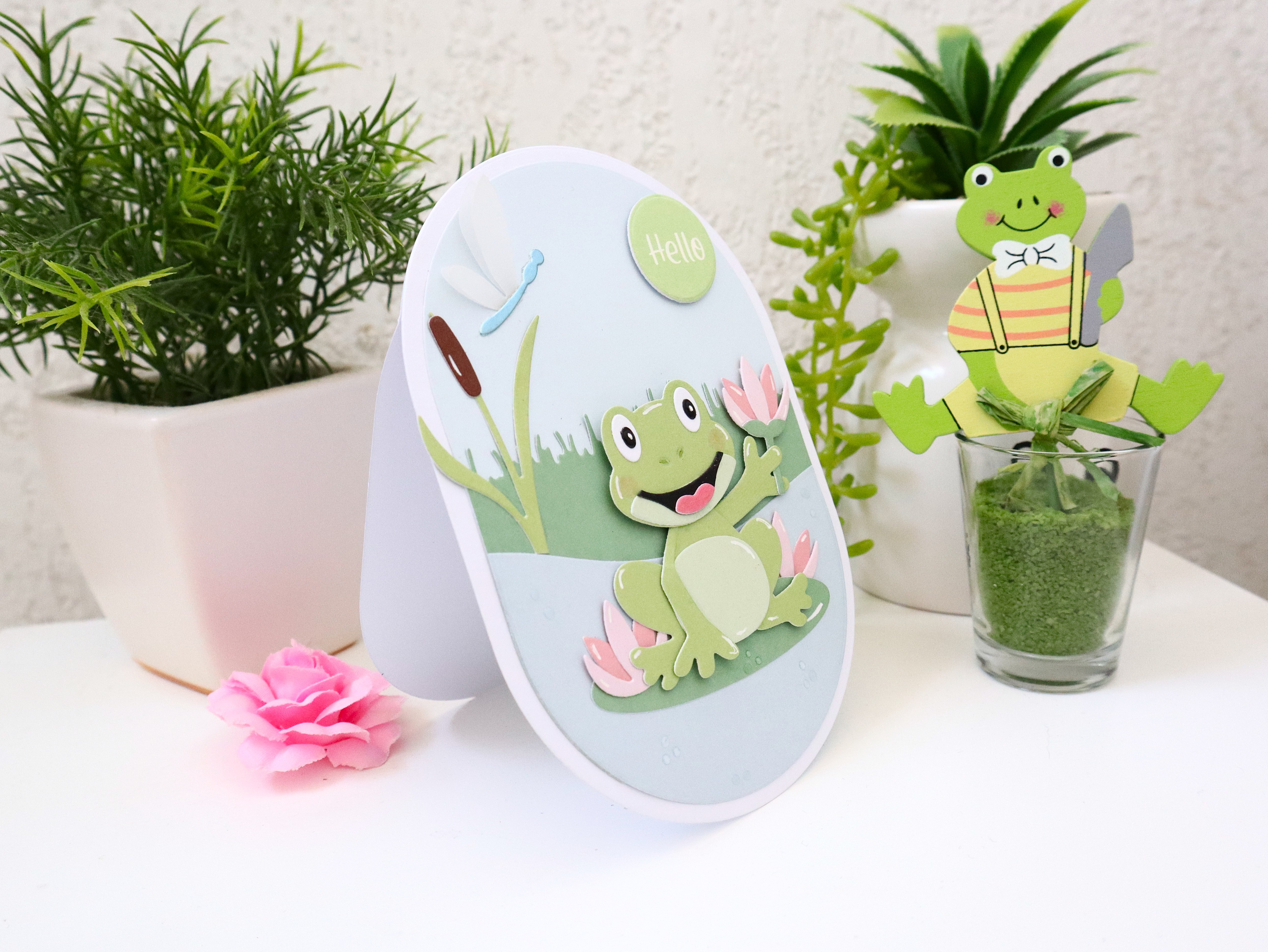Cette carte est fabriquée à la main avec des superpositions de papiers cartonnés de différentes textures et coloris, des éléments détaillés découpés avec des matrices de découpe ainsi qu'une multitude de petits détails : Originalité de la forme de la carte, montage en relief effet 3D de la grenouille, papier métallisé bleu pour le corps de la libellule, et papier vellum pour les ailes, petits points de vernis transparents pour imiter les gouttes d'eau, etc... ce qui rend cette création vraiment spéciale et inédite.