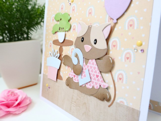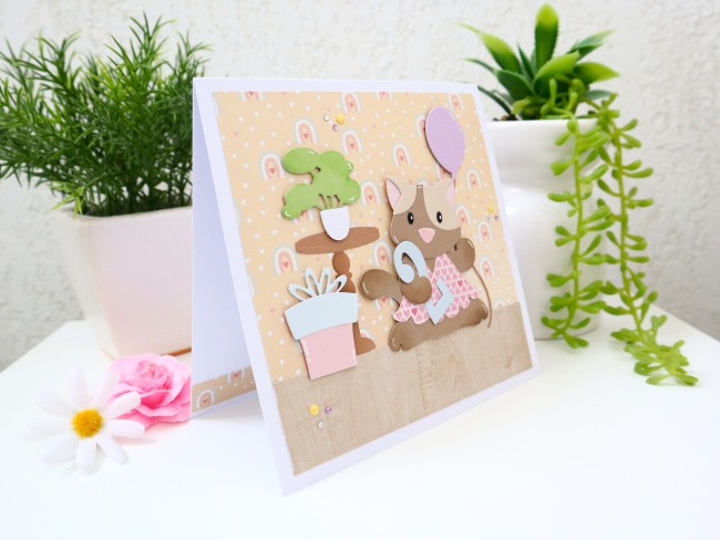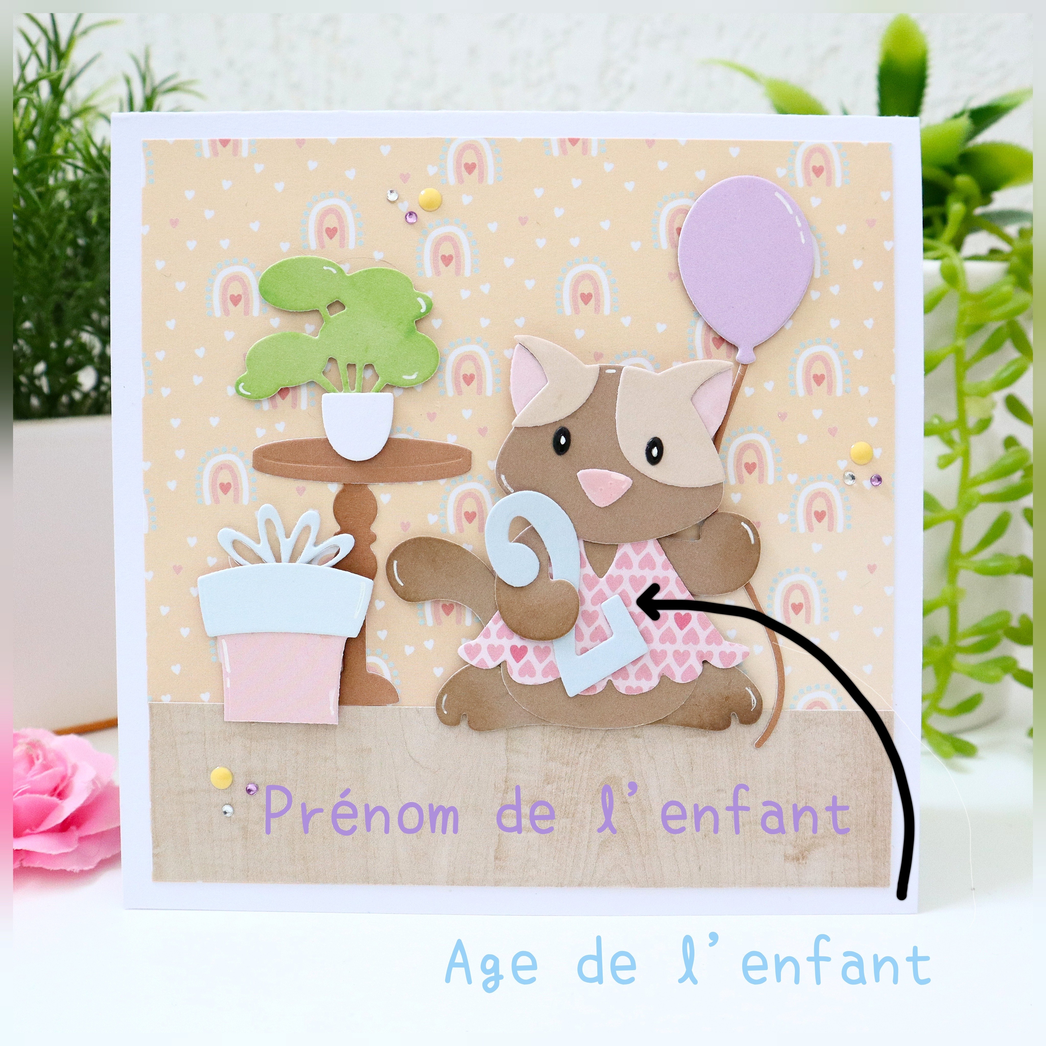 Cette carte est fabriquée à la main avec des superpositions de papiers design cartonnés de différentes textures et imprimés, des éléments détaillés découpés avec des matrices de découpe ainsi qu'une multitude de petits détails : Montage en relief effet 3D du chat, du ballon du cadeau et de la plante, demi perles jaunes, mini strass argenté et lilas, etc... ce qui rend cette création vraiment spéciale et inédite.