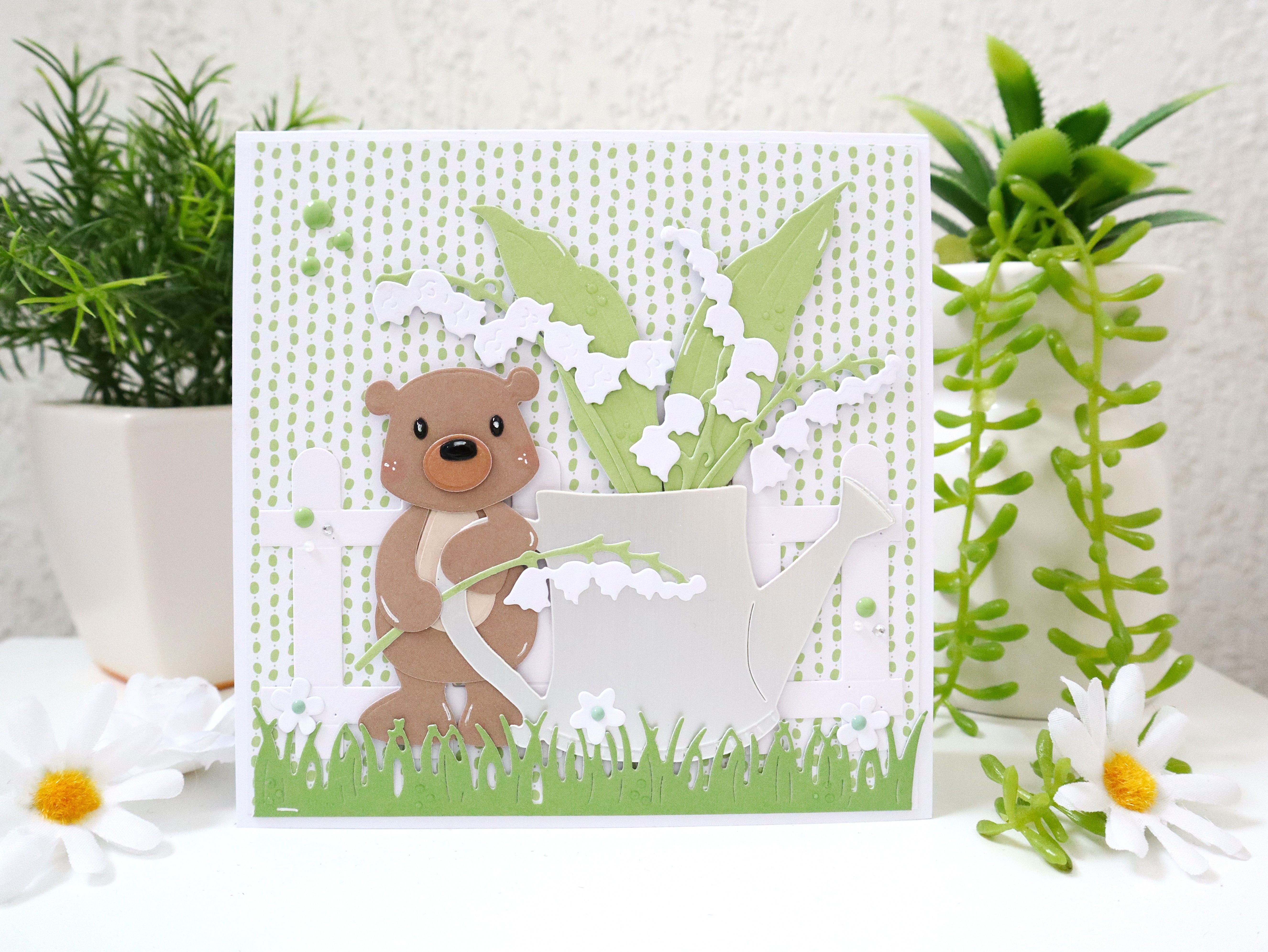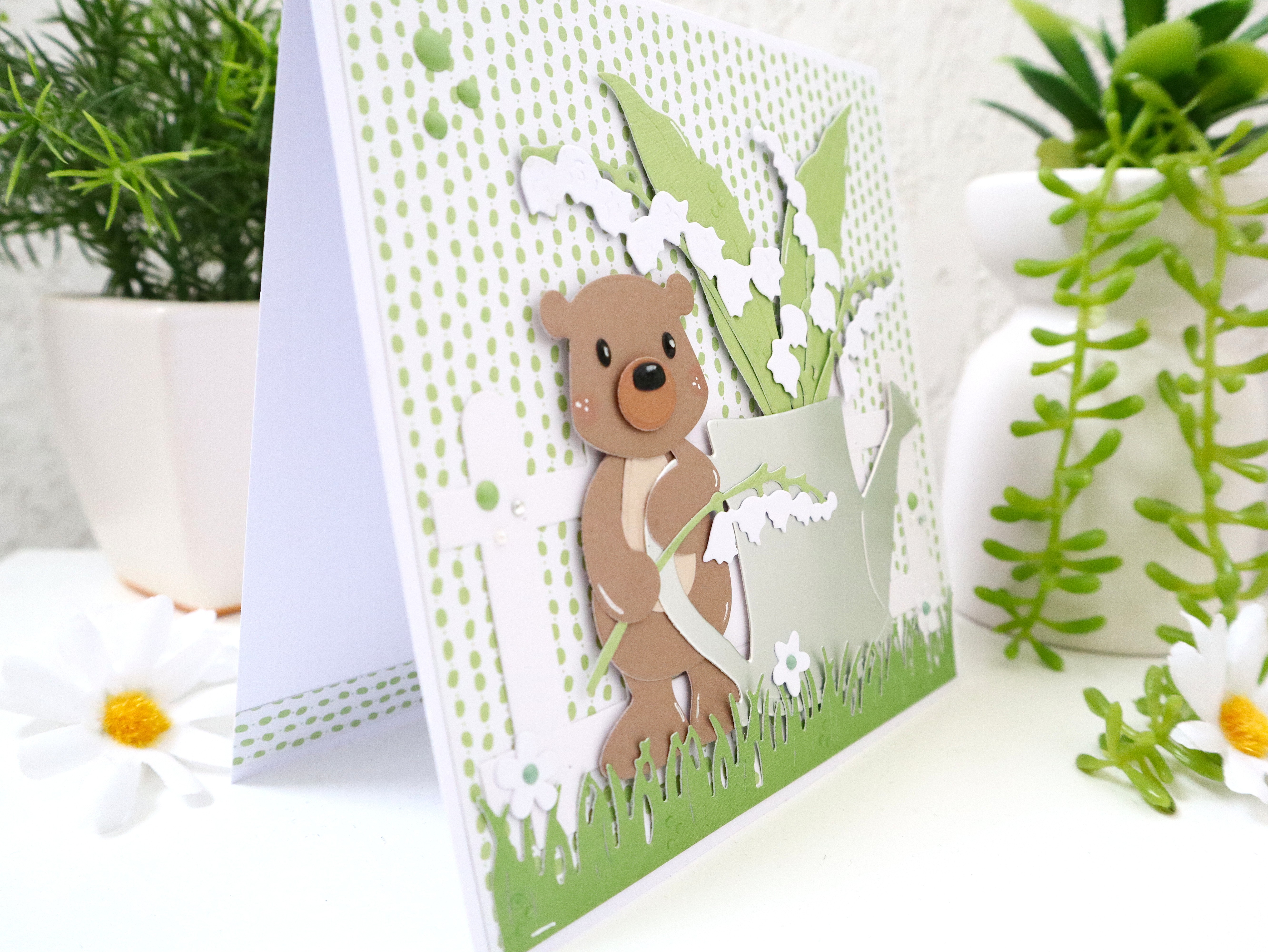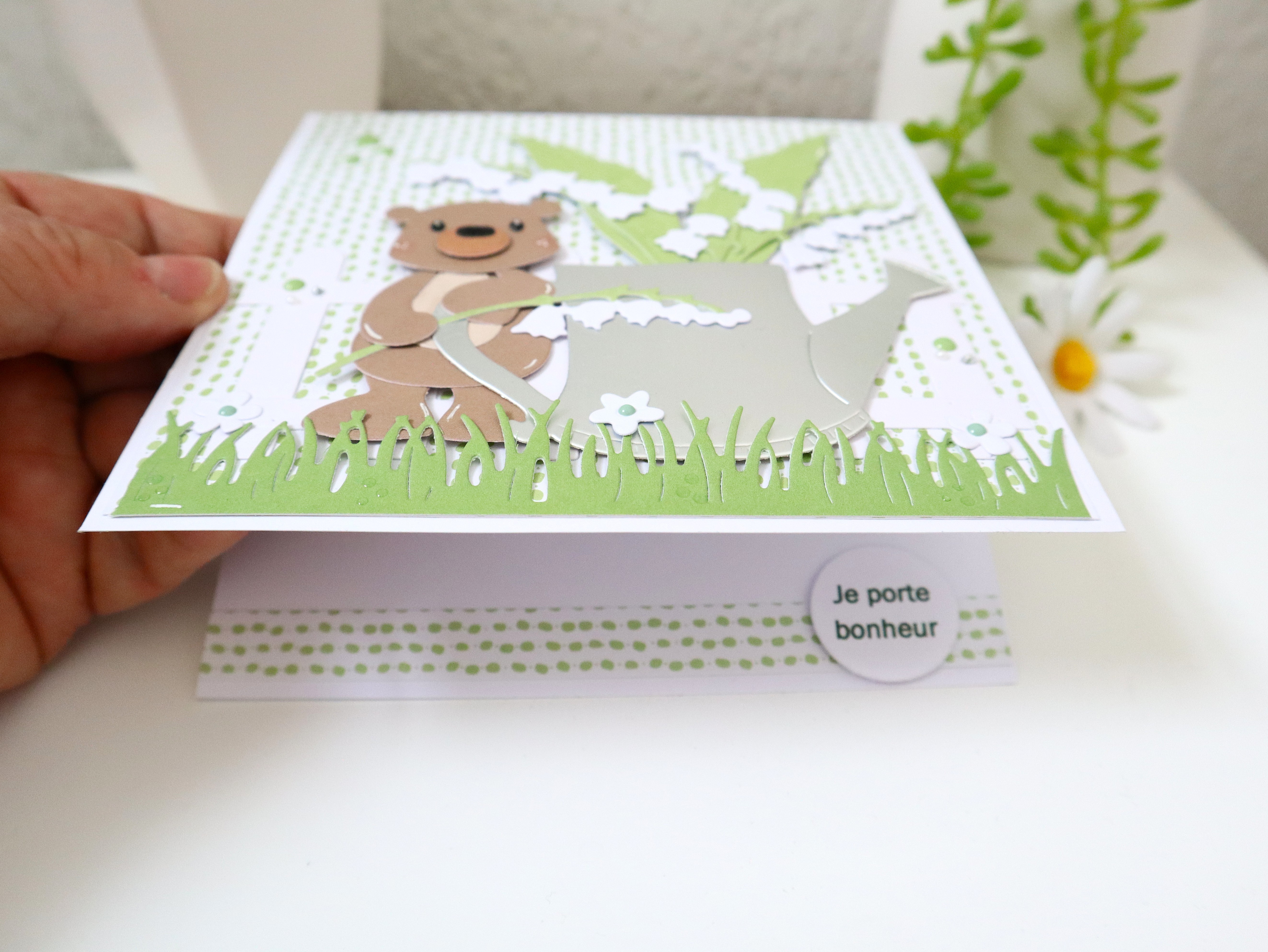 Cette carte est fabriquée à la main avec des superpositions de papiers design cartonnés de différentes textures et imprimés, des éléments détaillés découpés avec des matrices de découpe ainsi qu'une multitude de petits détails : Montage en relief effet 3D de l'ourson, de l'arrosoir et des brins de muguet, papier métallisé argent mat pour l'arrosoir, demi perles vertes et blanches, mini strass argentés, etc... ce qui rend cette création vraiment spéciale et inédite.