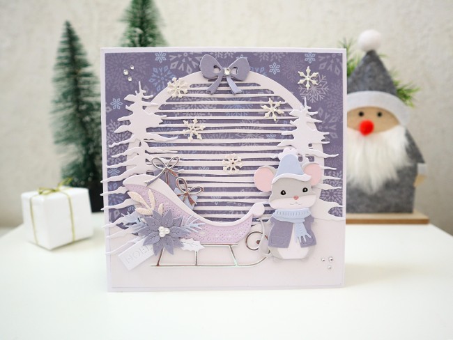 Carte de noël, traîneau, souris, cadeaux, sapins blancs, Carte de voeux originale 3D faite main, Carterie et papeterie